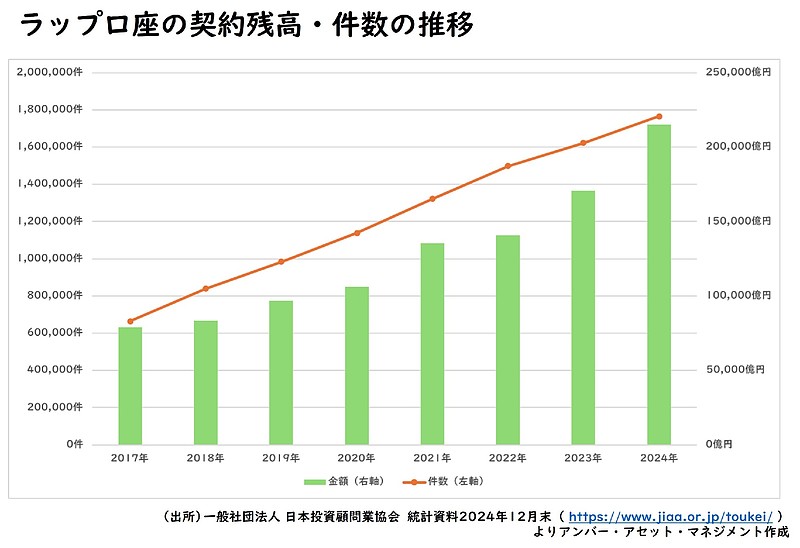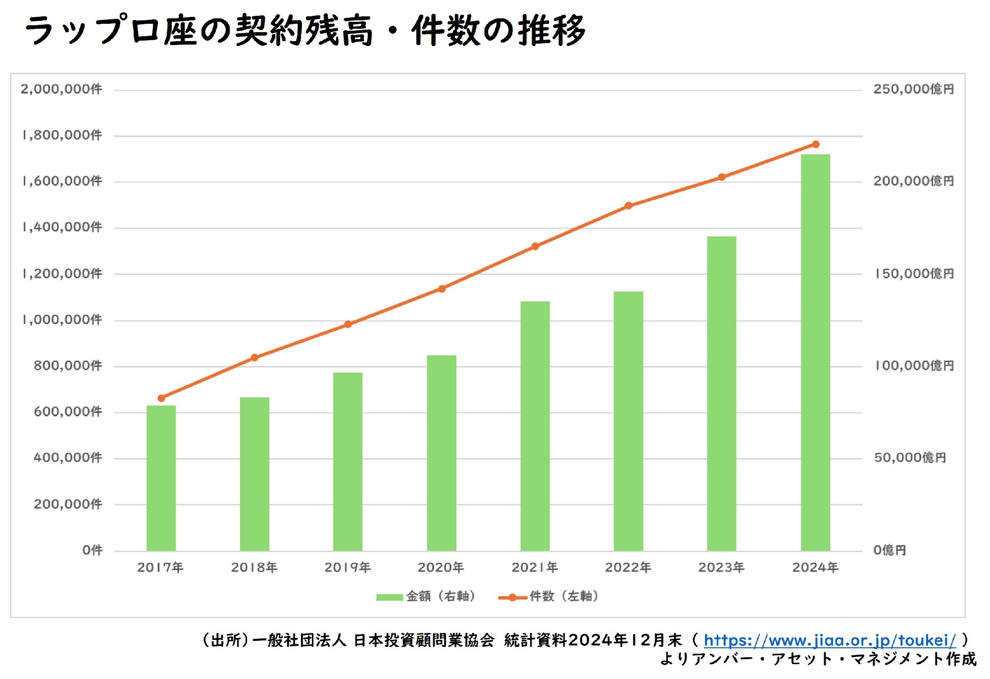 元々ラップ口座は富裕層向けのオーダーメイドの運用サービスだったのですが、2014年頃から定型化されたファンドラップサービスが登場して急速に残高を伸ばし、2024年末時点では契約件数は約176万件、預かり資産残高は約21.5兆円となっています。
