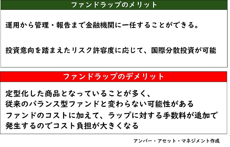 一方で販売されているファンドラップの大半は定型化した運用商品です。そして運用の中身を見ると複数の資産を組み合わせて分散投資したバランス型の投資信託と類似していることが多く、結局は従来のバランス型ファンドを形を変えて販売しているだけになっていることが多いです。