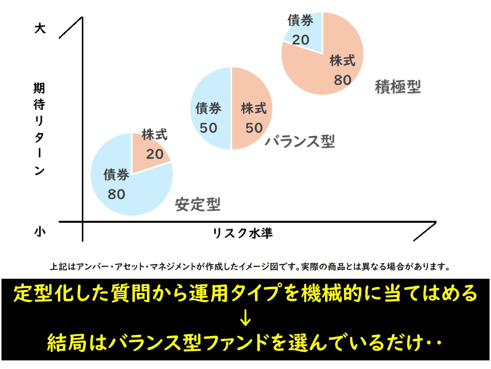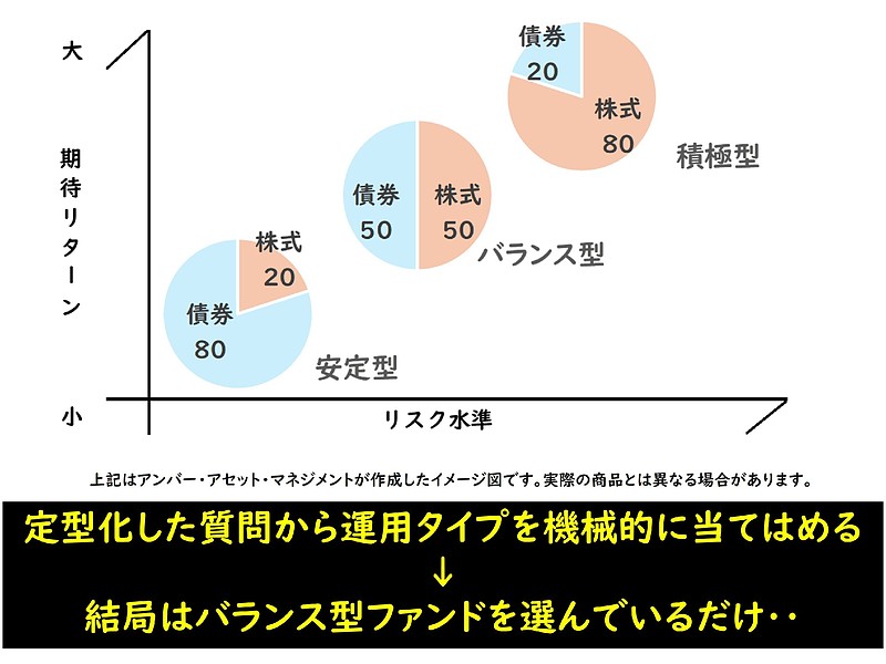 1点目の「定型化した商品となっていることが多く、従来のバランス型ファンドと変わらない可能性がある」ですが、購入する際に、アンケート等でお客様のリスクに対する考え方を分類してタイプ分けすることで、運用タイプに応じたバランス型ファンドを機械的に当てはめることで、結局はバランス型ファンドを選んでいるだけになっていることが多く見られることです。
