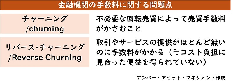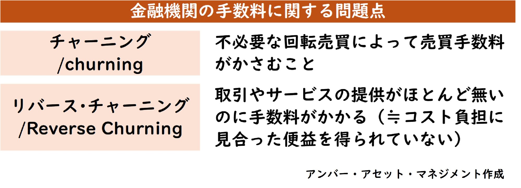 金融機関がお客さまにとって不必要な回転売買を勧めて売買手数料がかさんでしまう問題をチャーニングと呼ぶのですが、このように金融機関との取引やサービスの提供がほとんどないのに手数料がかかること、言い換えればコスト負担に見合った便益を得られない問題をリバースチャーニングと言います。