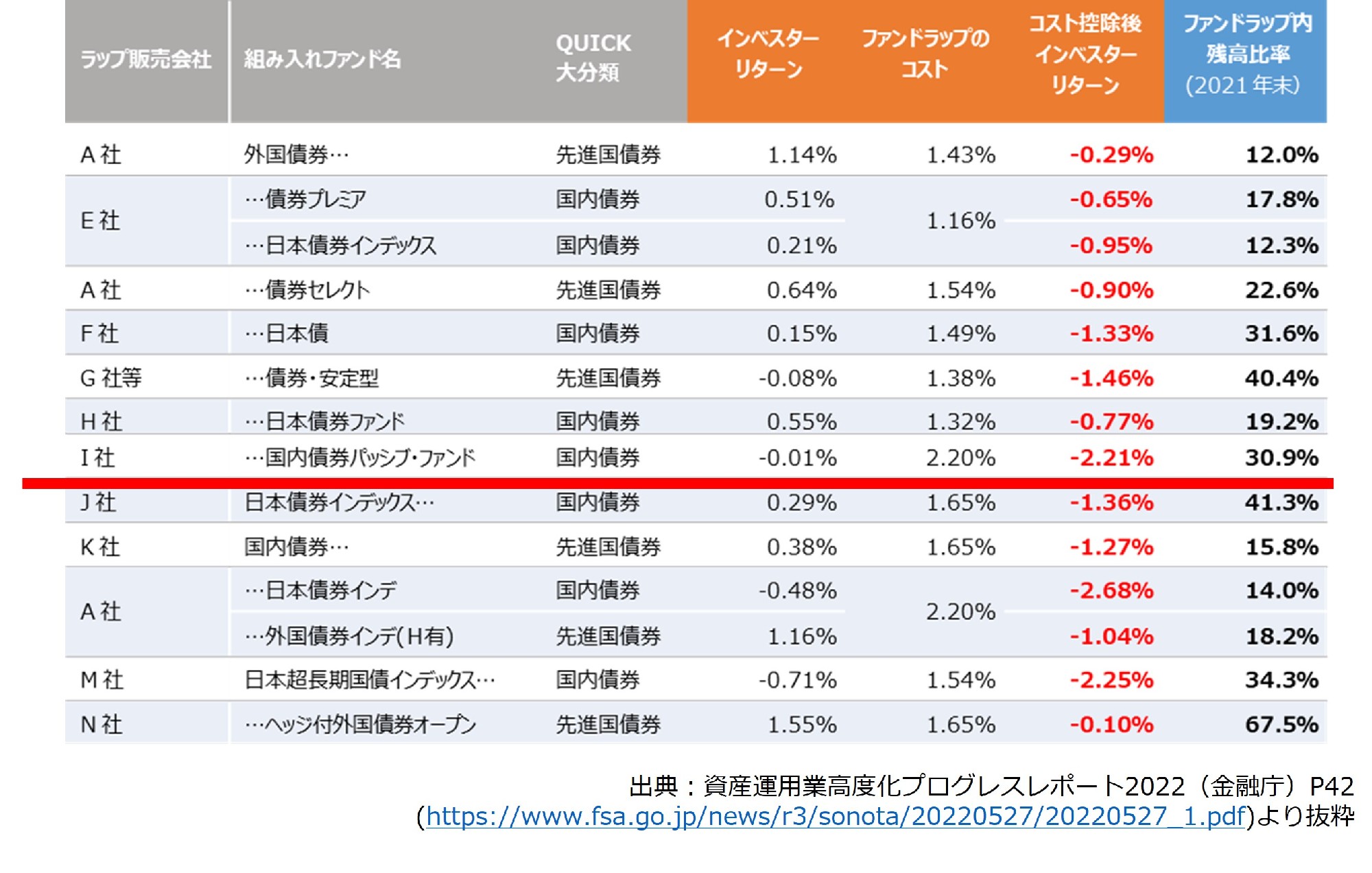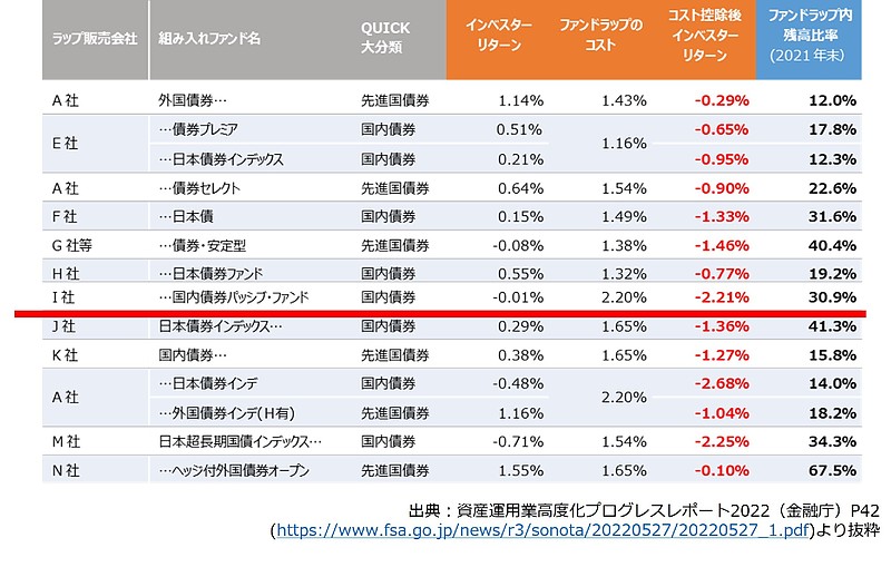 これは金融庁のレポートの抜粋ですが、端的な例として赤線で引いているファンドでは、国内債券のファンドでほとんどリターンが上がっていないのにコストが2.2%かかることでマイナスになっているのですが、ファンドラップ内で実に3割以上の資産を占めています。