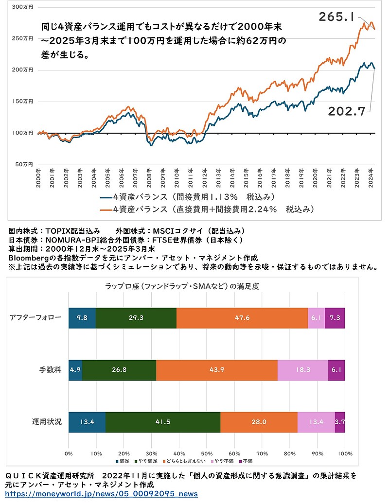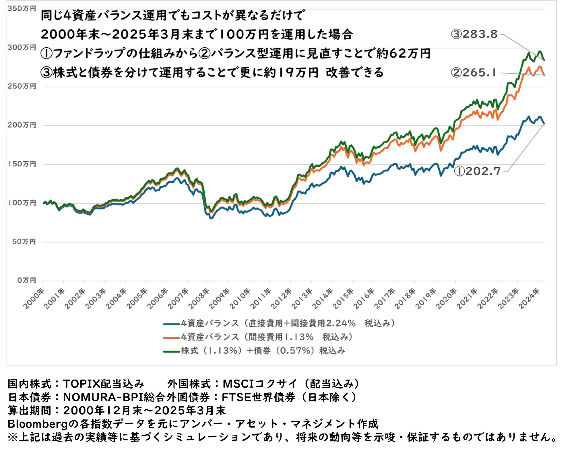 一般的な株式と債券のバランス運用をファンドラップ(先ほどの直接費用と間接費用を合わせた2.24% 税込み)と投資信託(間接費用のみ1.13% 税込み)で行った場合の簡易的なシミュレーションで比較すると、2000年末の100万円の元本が2025年3月末でファンドラップと投資信託とで運用成果に約62万円の差が生じます。