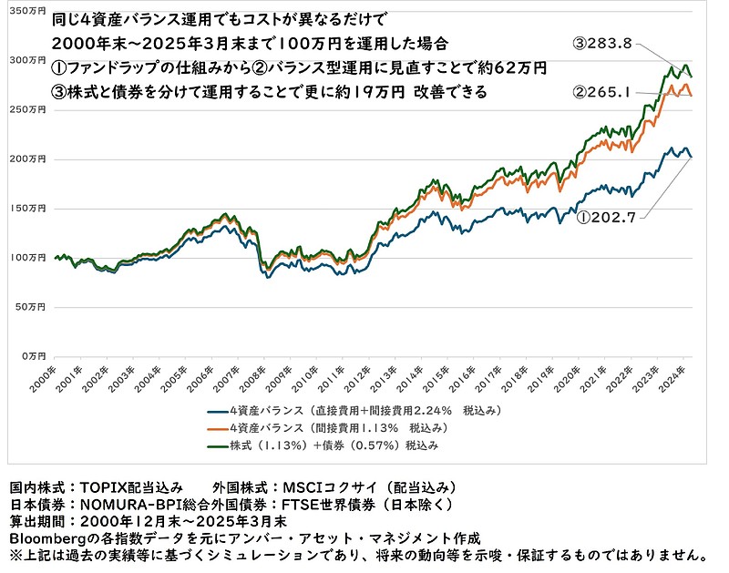 先ほどのシミュレーションに株式を先ほどのコスト1.13%、債券をその半分となる0.57%に分けて運用した場合を緑の線で加えたグラフになっています。2000年末の100万円の元本が2025年3月末でファンドラップと投資信託とで運用成果に約62万円改善するのに加えて、更に19万円改善することが分かります。