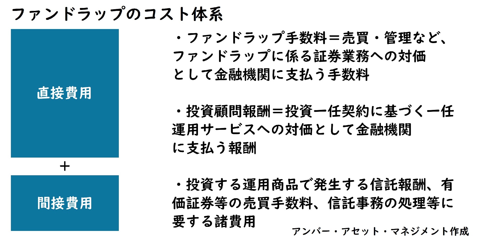 直接費用と間接費用です。二重で手数料が存在するということです。金融機関に運用を一任することで、売買・管理などファンドラップに関わる証券業務への対価として金融機関に支払う手数料や、投資一任契約に基づく一任運用サービスへの対価として金融機関に支払う報酬などが直接費用として発生します。それに組み合わせるファンドで発生する信託報酬、有価証券等の売買手数料、信託事務等の処理等に関する諸費用が間接費用として発生します。