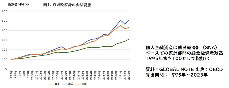 日本の家計における金融資産は日本銀行の資金循環統計で2025年3月末は約2200兆円となっています。一方で伸び率を日本、米国、欧州(イギリス、ドイツ、フランス)の個人金融資産推移で比較すると、1995年末から2023年末の28年間で米国は約5倍、欧州の約4倍に対して日本は約3倍と日本の伸び率が低いことが分かります。