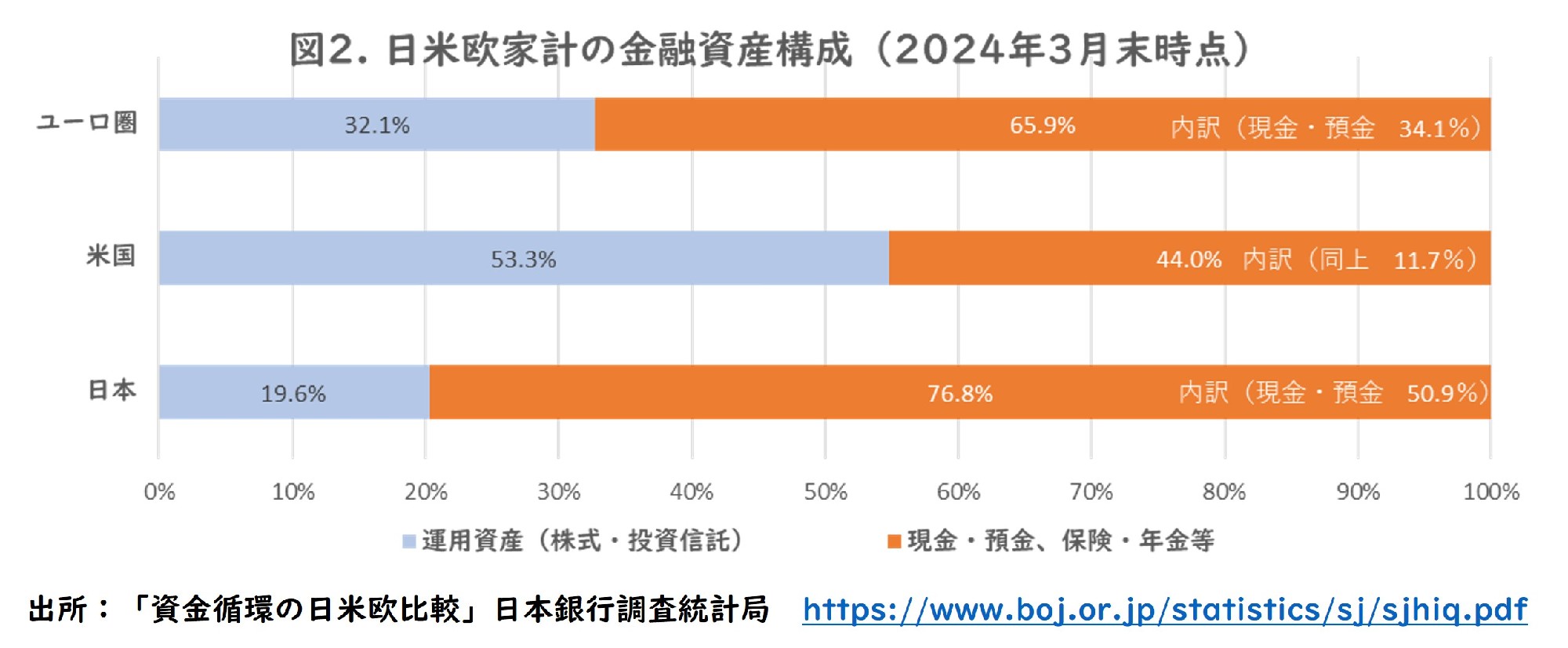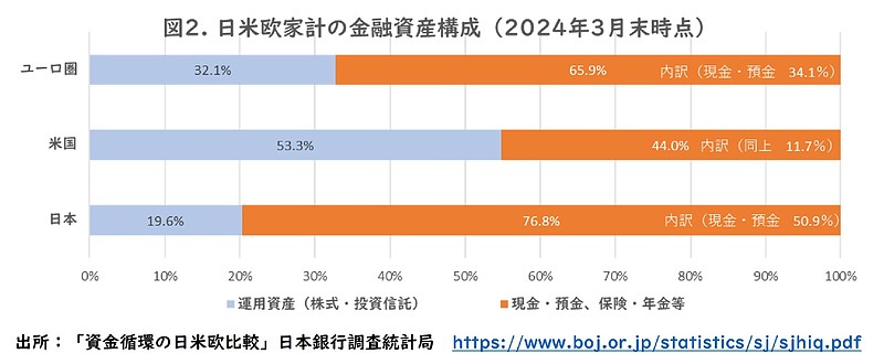 2022年3月時点で日本の運用資産の割合は15%程度でしたのでこの2年間で5%程度引き上がっていますが、米国や欧州に対して株式や投資信託などの運用資産の割合を引き上げていく余地はまだあると思います。