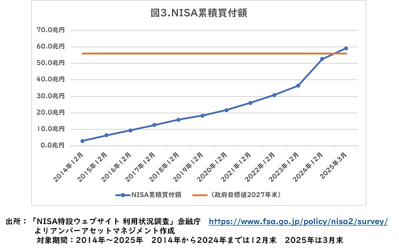 日本では2024年に新しいNISA制度が開始したことなどを背景に利用が拡大して2025年3月時点の速報ではNISA累積買付額が約59兆円と政府が2027年末での目標としていた56兆円を前倒しで達成しています。