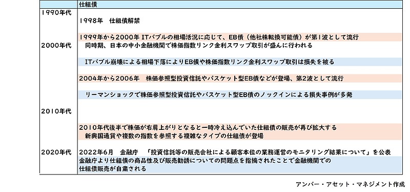 ここでは新興国通貨や複数の指数を参照する複雑なタイプの仕組債が登場しています。これらもお客様とトラブルになる事例が見られており、2020年代に入ってから当局の目が厳しくなって、2022年6月に金融庁のレポートで仕組債の商品性や販売勧誘などについて問題を指摘したことで、金融機関の仕組債販売が自粛されるようになって今に至っています。
