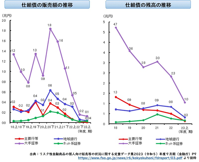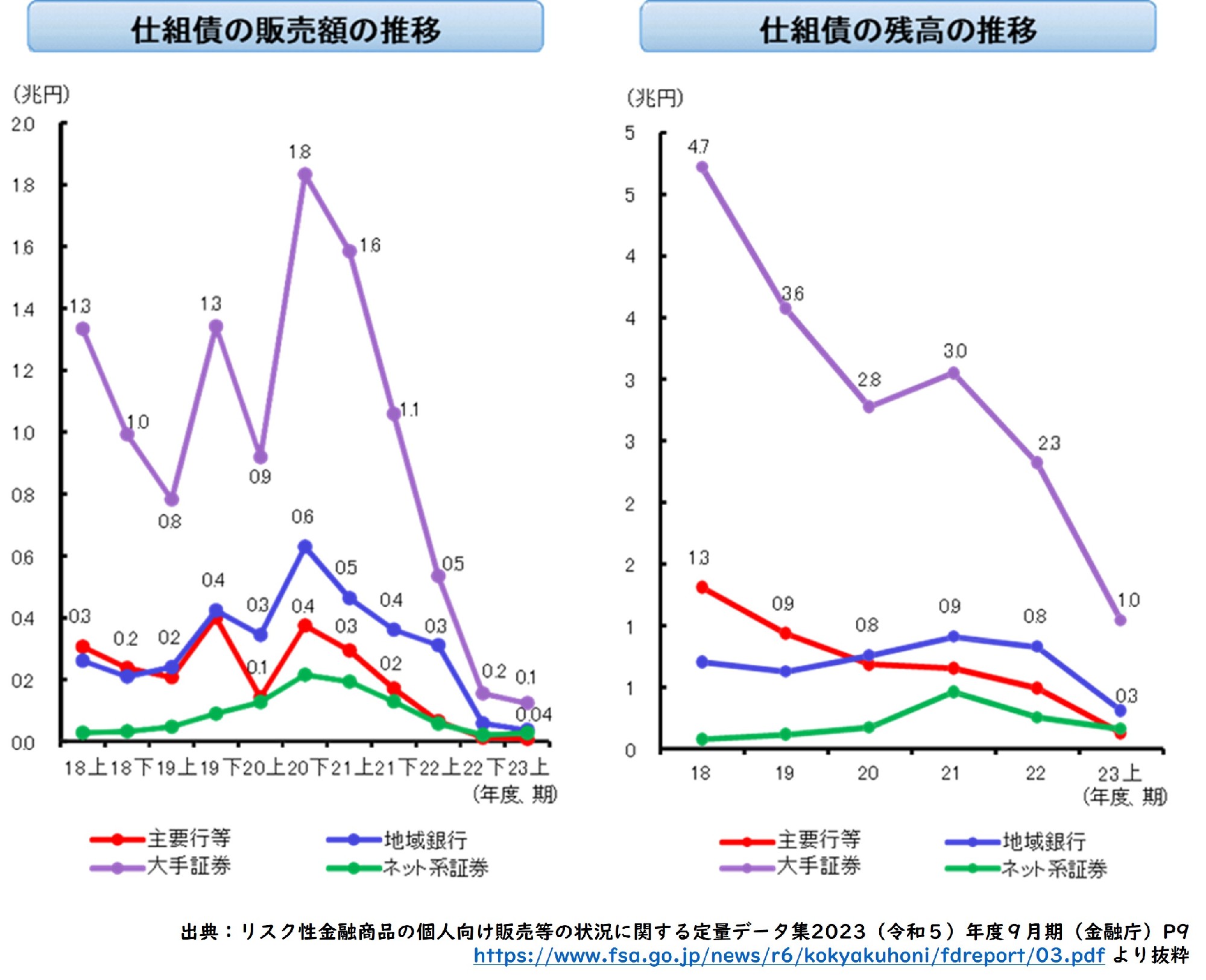 こちらの図は仕組債の販売額や残高の推移となりますが、販売額および残高は2022年以降急速に減少傾向にあることが確認できます。