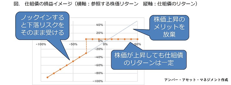 すなわち、株価の下落リスクを負担することでハイリスクであることに対して、株価がどんなに上昇しても、仕組債のリターンは一定のローリターンの商品ということになっています。