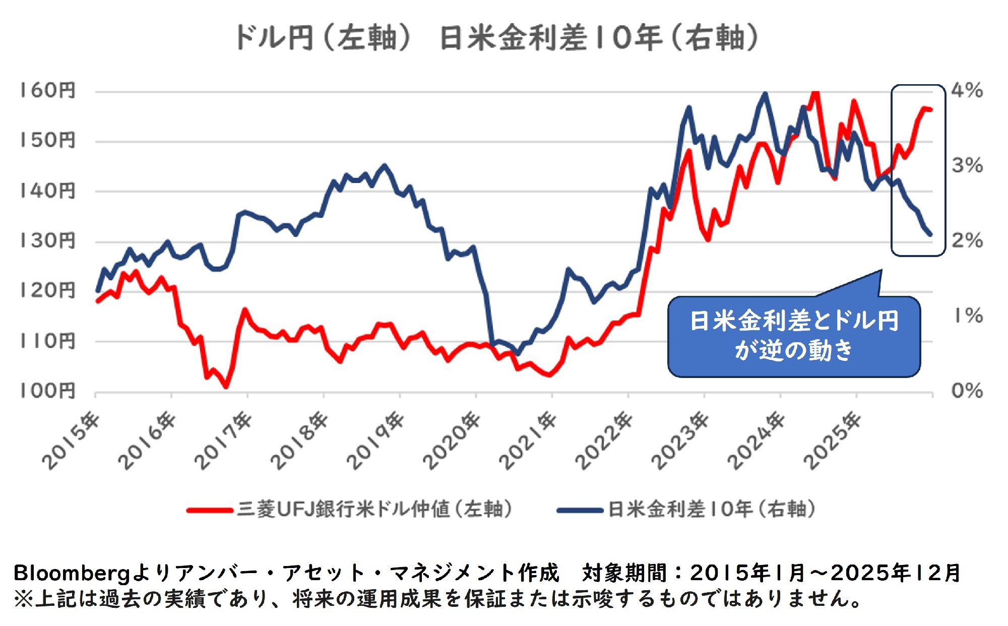 それが2025年6月以降、日米金利差が縮小しているのに対してドル円は円安方向へと逆の動きを見せています。