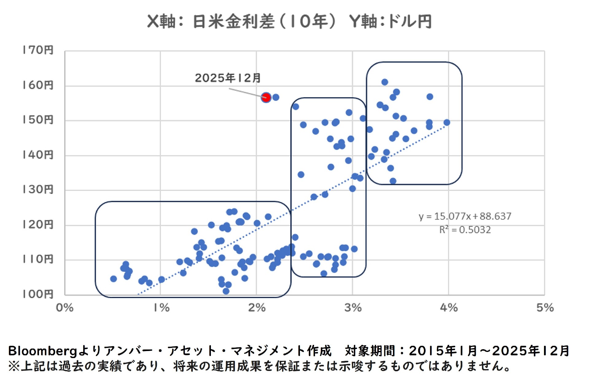 - 日本と米国の10年国債利回りで見た金利差とドル円水準について、2025年6月以降、日米金利差が縮小しているのに対してドル円は円安方向へと逆の動きを見せている。