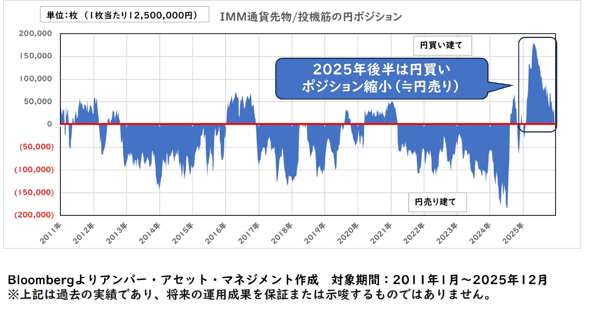 その結果として、2025年後半にかけて円買いポジションの解消が進んだことが、円売り(≒円安)要因の一つになっていた可能性があると考えられます。