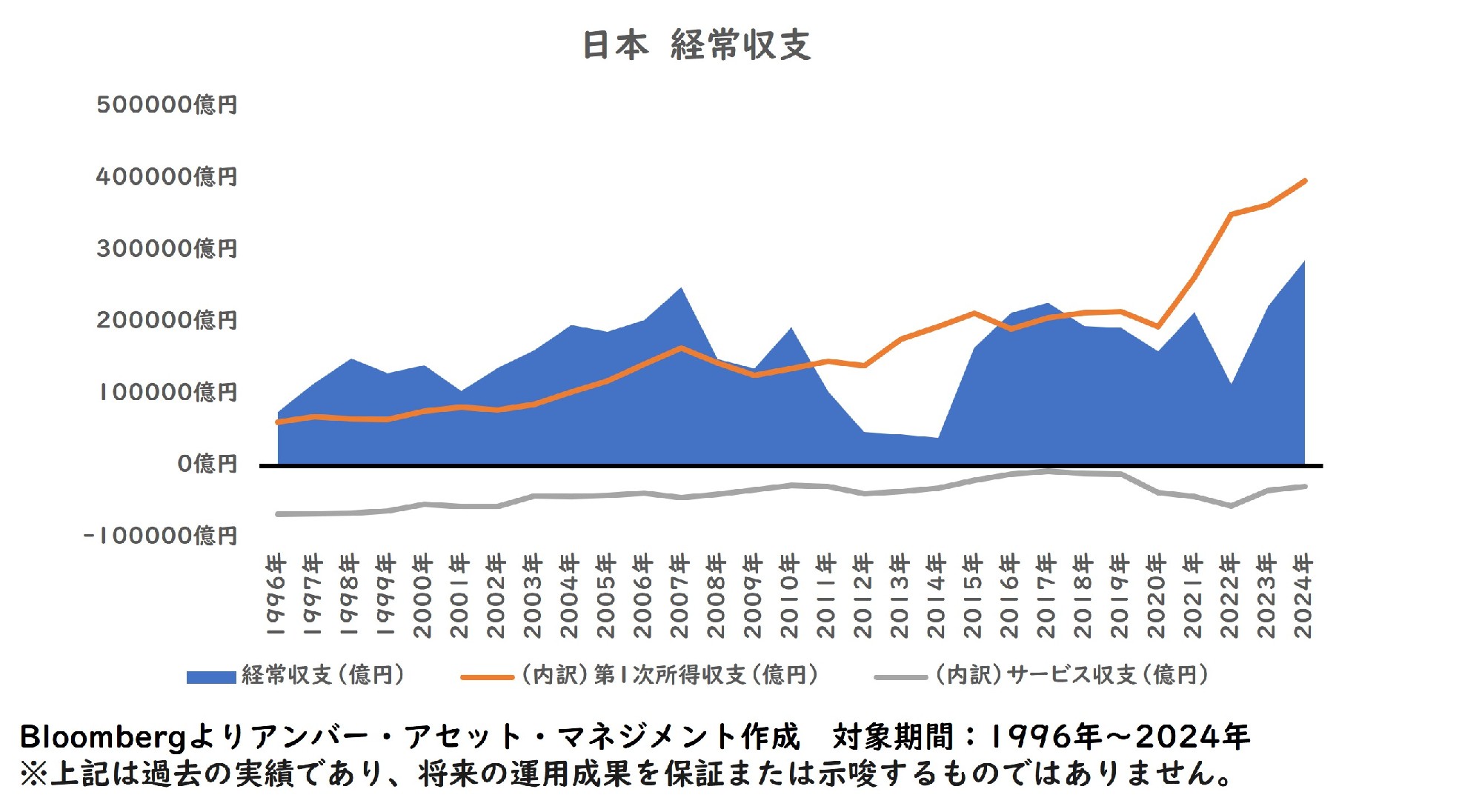 一方で、灰色の線で示しているデジタル関連(著作権等使用料、情報サービス、コンサルなど)の赤字が拡大しており、これは恒常的な円安要因となる「構造的なサービス赤字」として意識されています。但し、過去の実績によると赤字幅は一定の水準で推移しており、円売り圧力がここ1-2年で高まっているとは言えないようです。