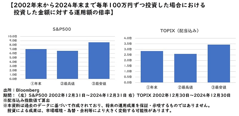 また、先ほどは年単位での投資行動でしたが、1年の間でも相場は大きく上下します。その際に「その年の最安値で投資したい」とお考えになるお客さまも多いかと思います。次に米国株(S&P500)と日本株(TOPIX)を2002年末から2024年末までの期間で毎年100万円ずつ投資した場合について、以下の3パターンを比較します。