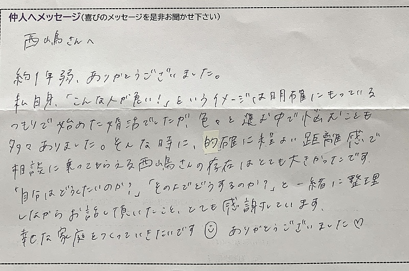 私自身「こんな人が良い!」というイメージは明確にもっているつもりで始めた婚活でしたが、色々と進む中で悩んだことも多々ありました。そんな時に的確に程よい距離感で相談に乗ってもらえる西嶋さんの存在はとても大きかったです。