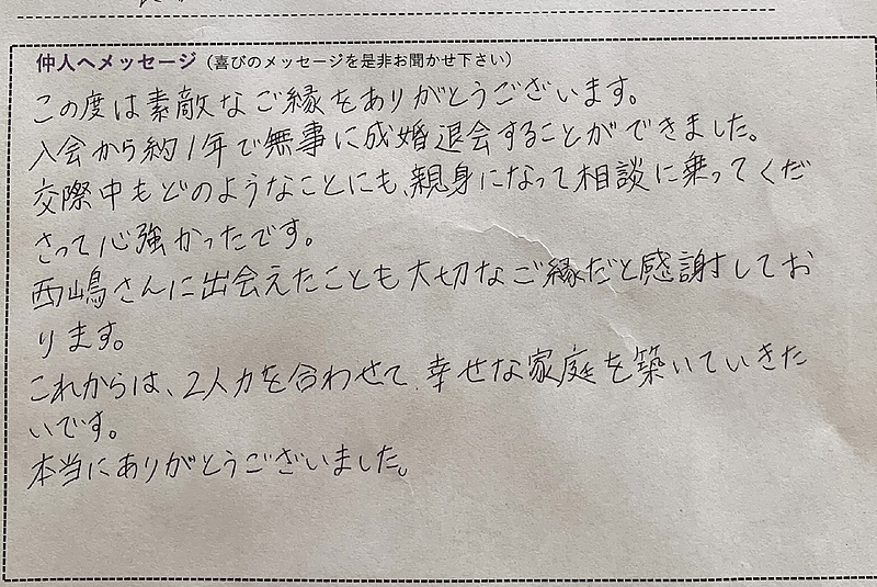 この度は素敵なご縁をありがとうございます。入会から約1年で無事に成婚退会することができました。交際中もどのようなことにも、親身になって相談に乗ってくださって心強かったです。西嶋さんに出会えたことも大切なご縁だと感謝しております。これからは、2人力を合わせて幸せな家庭を築いていきたいです。本当にありがとうございました。