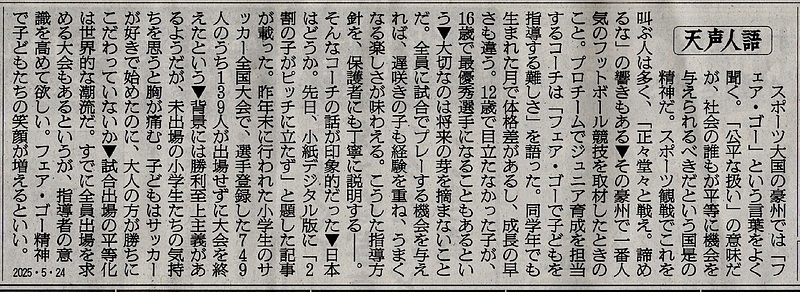 ふとしたことがきっかけとなって、叔母から一つの新聞記事を紹介されました。『フェア・ゴー』についてです。この言葉の意味については、記事に書かれているように、『スポーツ大国の豪州では「フェア・ゴー」という言葉をよく聞く。「公平な扱い」の意味だが、社会の誰もが平等に機会を与えられるべきだという国是の精神だ。』とあります。その一方で、この日本ではサッカーの小学生の大会で2割が試合に出れなかったそうです。