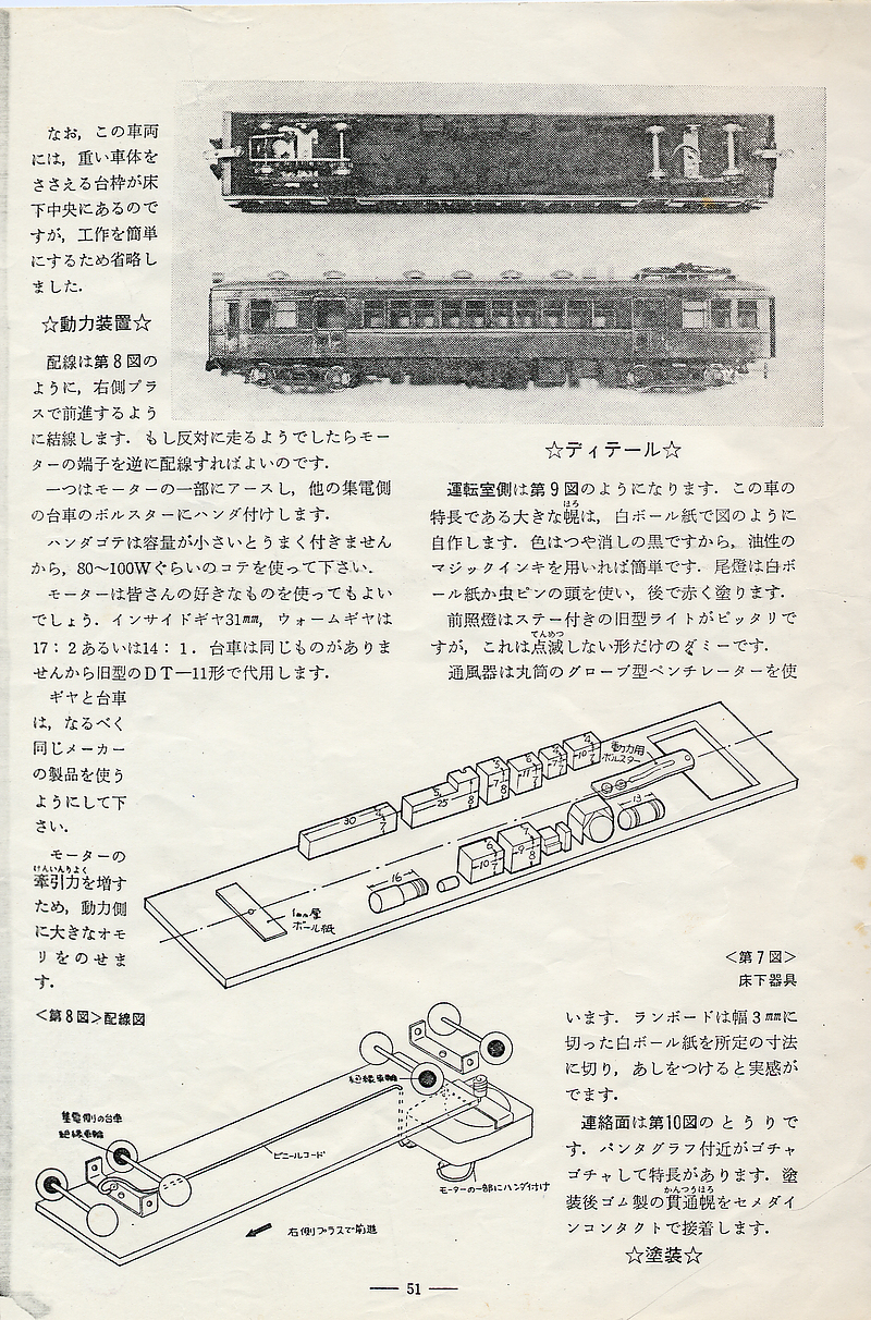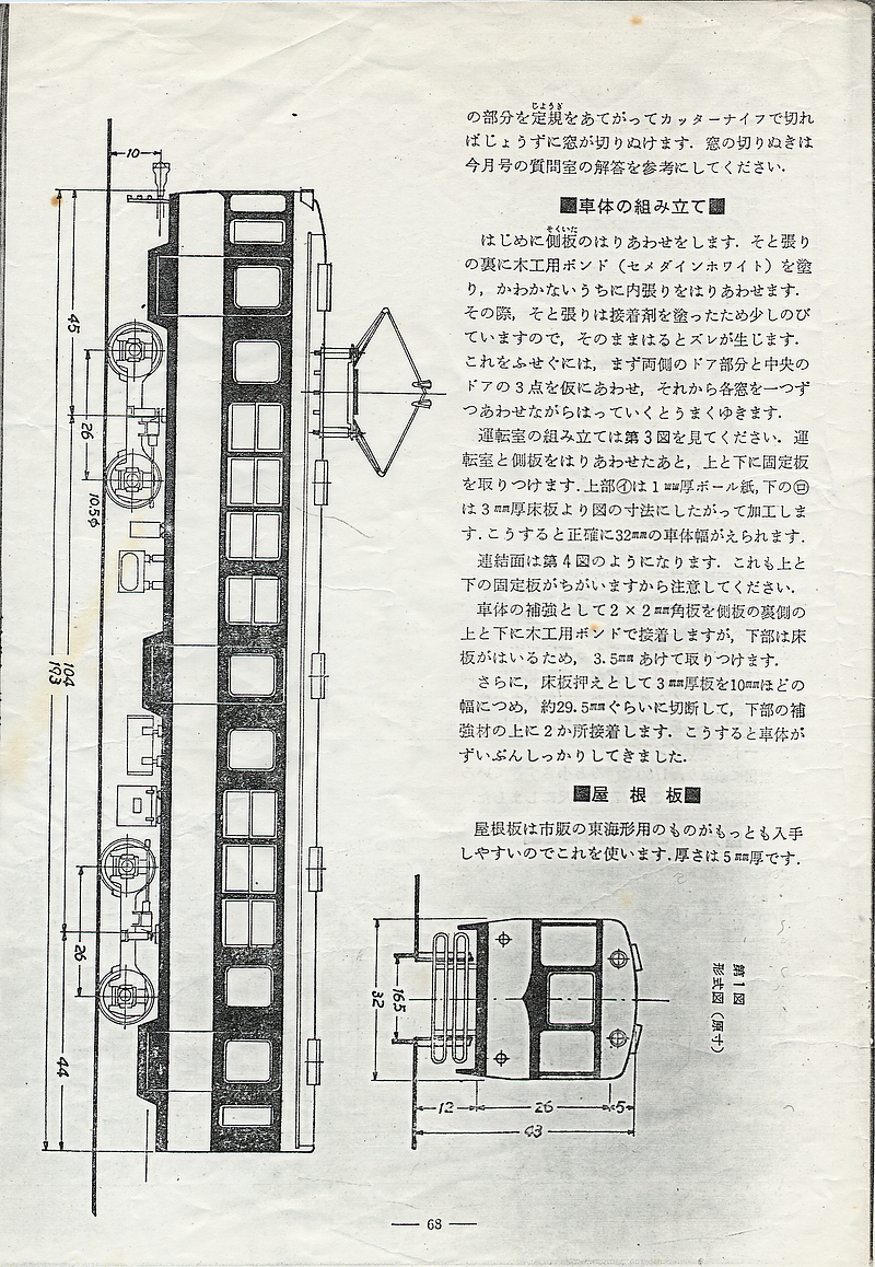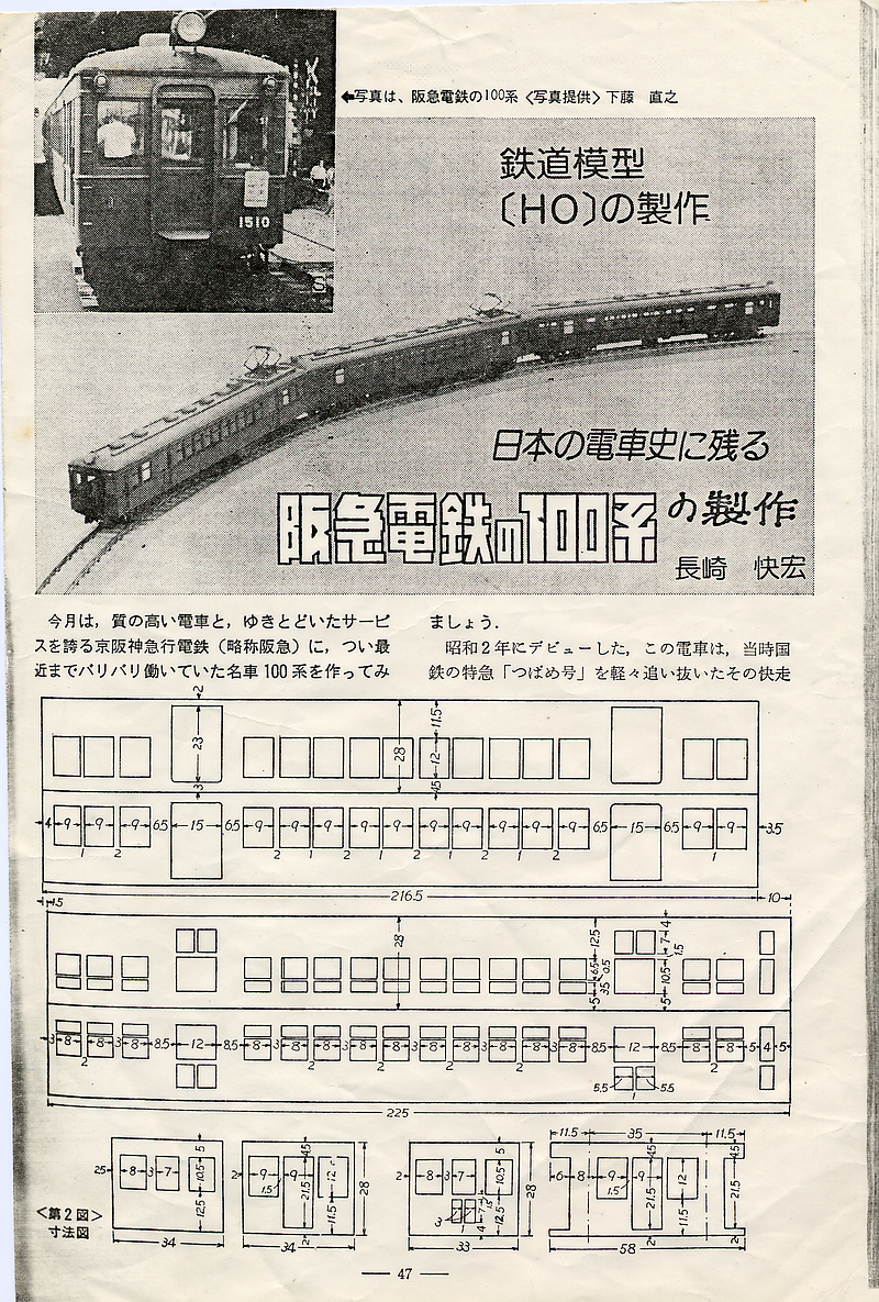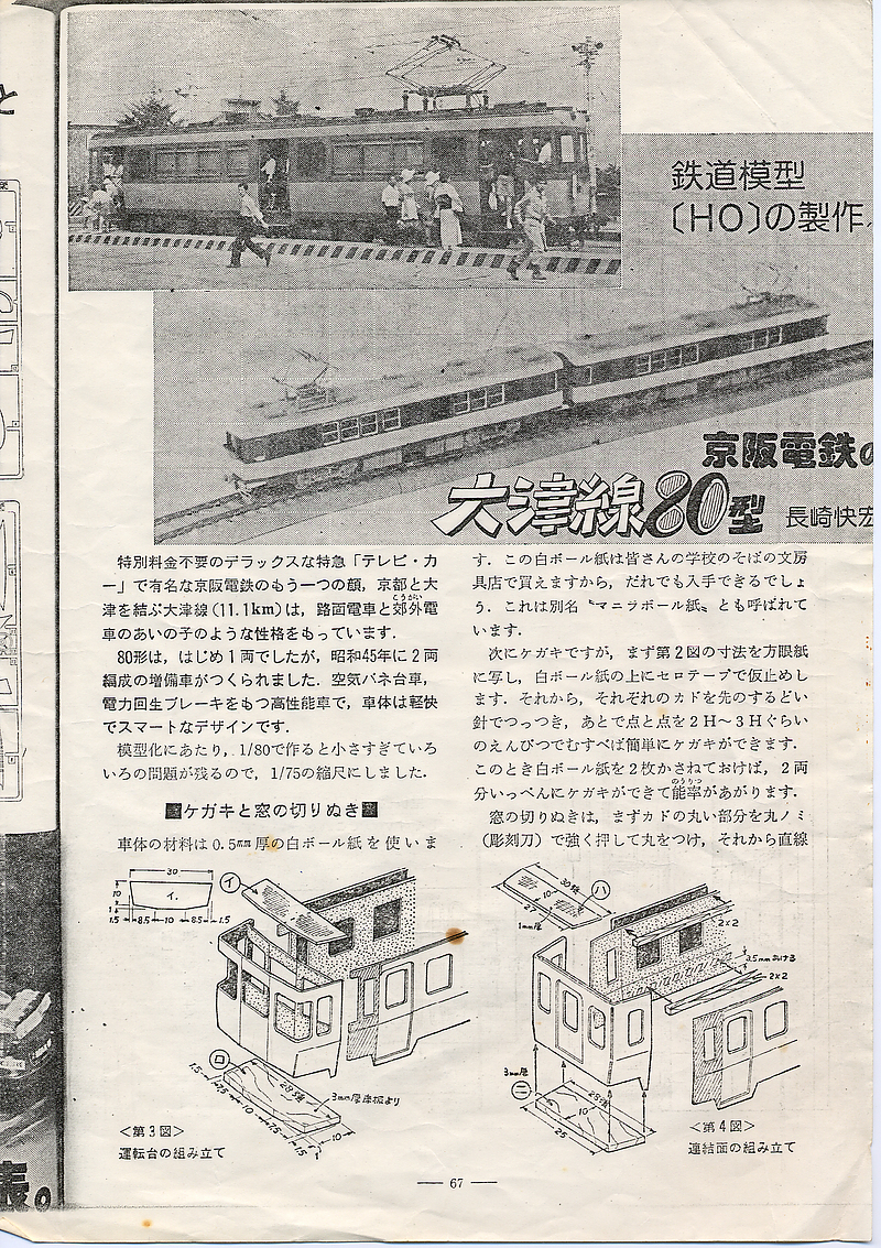 そんなNゲージが出現してからさほど年月も経っていない50年程前のお話です。当時はまだHOゲージが主体でした。模型とラジオという雑誌があり、そこに毎月鉄道模型の作り方が連載されていました。今でも鉄道模型の雑誌で散見される、作例を自慢するものではなく、あくまでも小中高生に作り方をしっかり教えるものでした。近所の図書館にその雑誌があったので、それを借りて、近場で唯一コピーができた文房具屋さんでコピーをしました。下記がそのコピーになります。京阪の80系と阪急の100系の記事です。