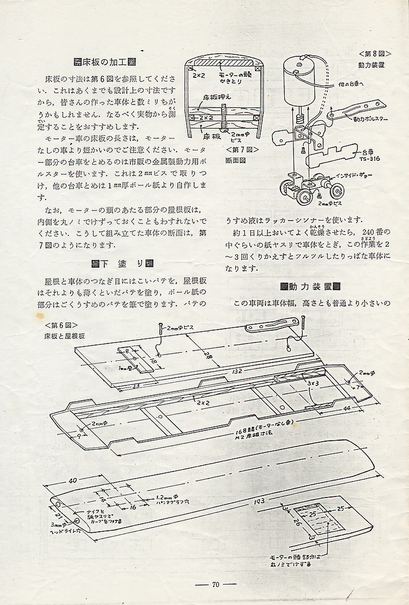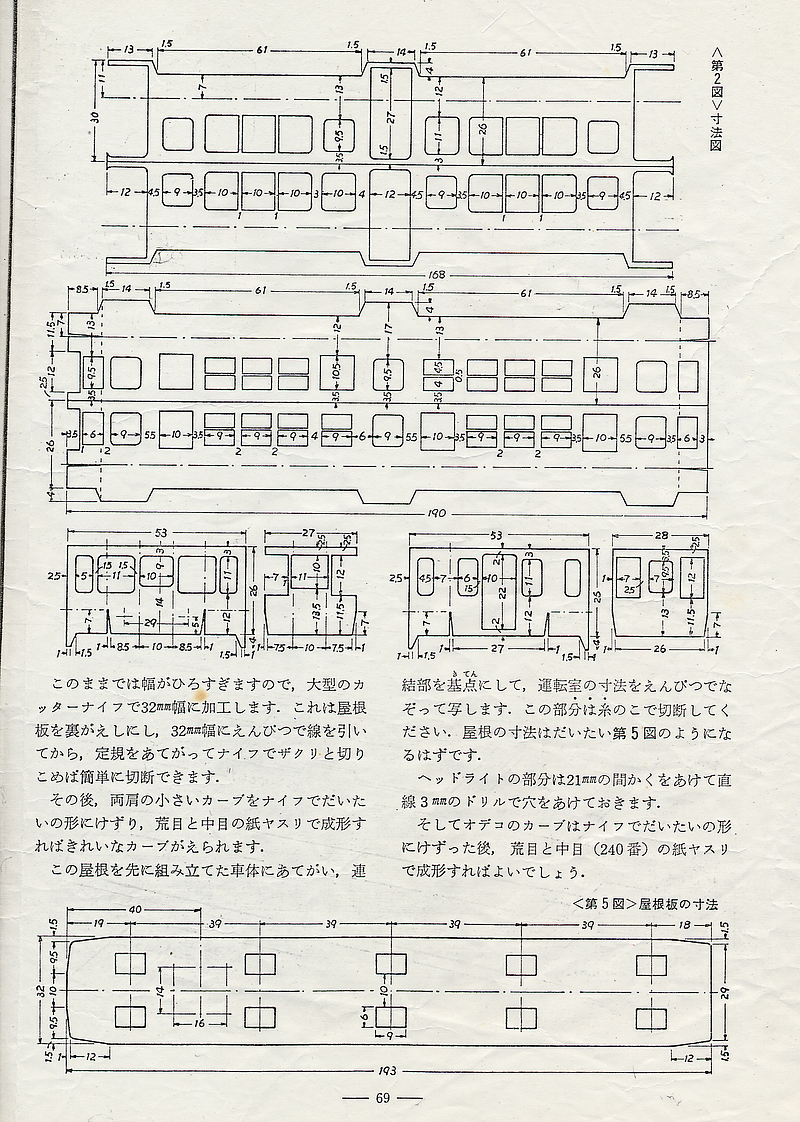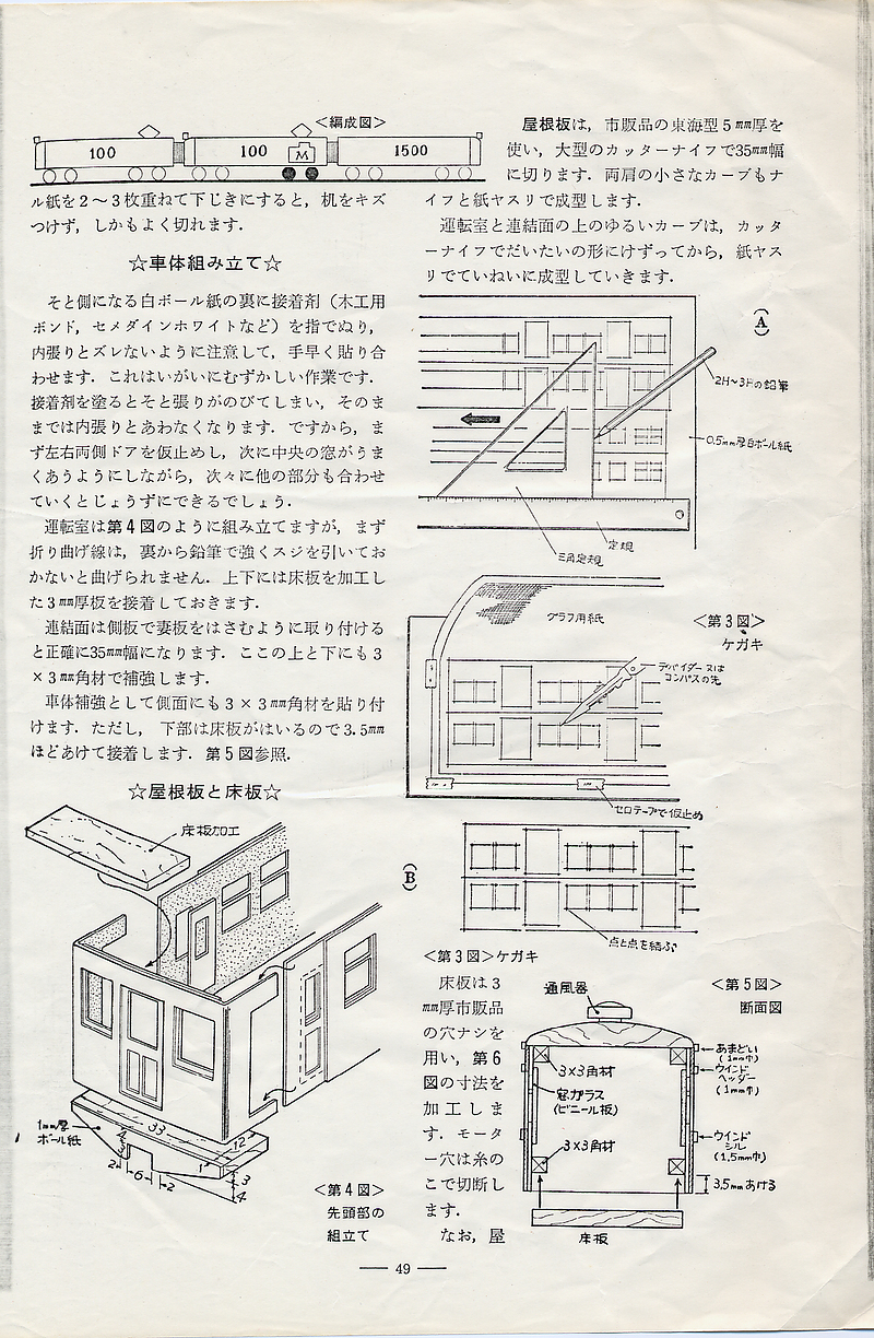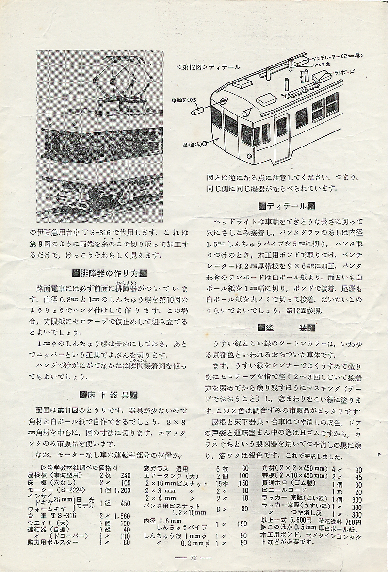 そんなNゲージが出現してからさほど年月も経っていない50年程前のお話です。当時はまだHOゲージが主体でした。模型とラジオという雑誌があり、そこに毎月鉄道模型の作り方が連載されていました。今でも鉄道模型の雑誌で散見される、作例を自慢するものではなく、あくまでも小中高生に作り方をしっかり教えるものでした。近所の図書館にその雑誌があったので、それを借りて、近場で唯一コピーができた文房具屋さんでコピーをしました。下記がそのコピーになります。京阪の80系と阪急の100系の記事です。