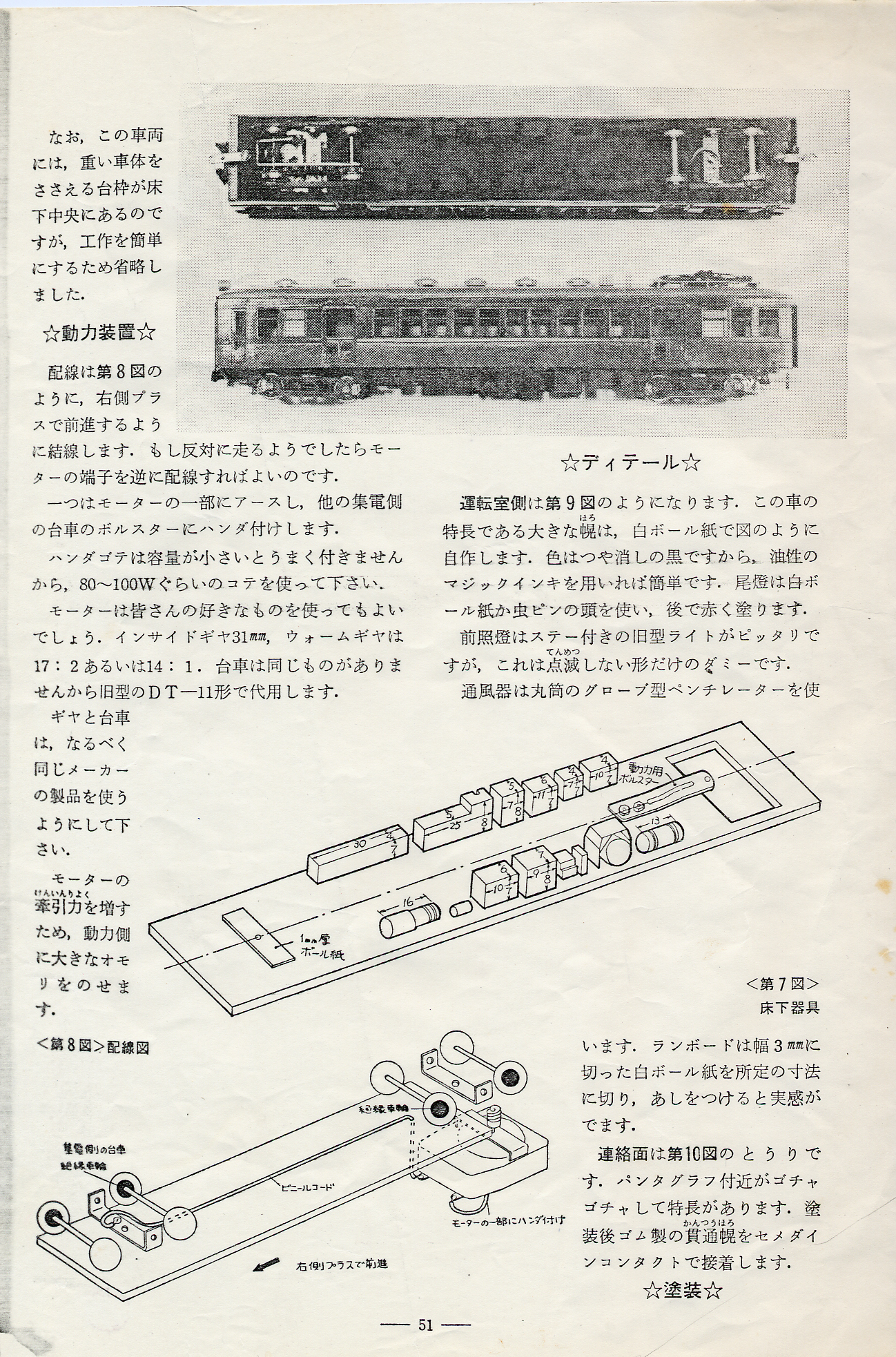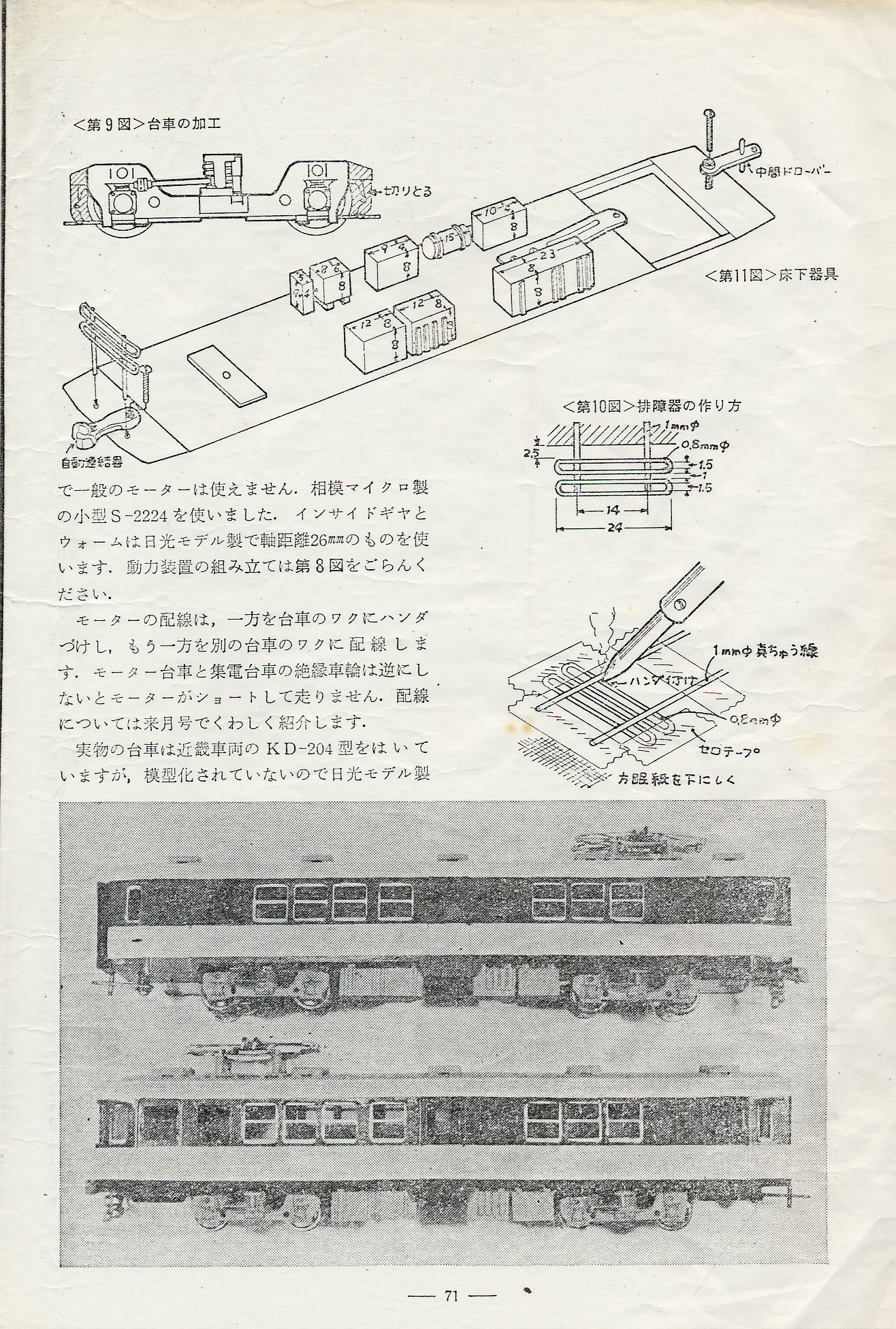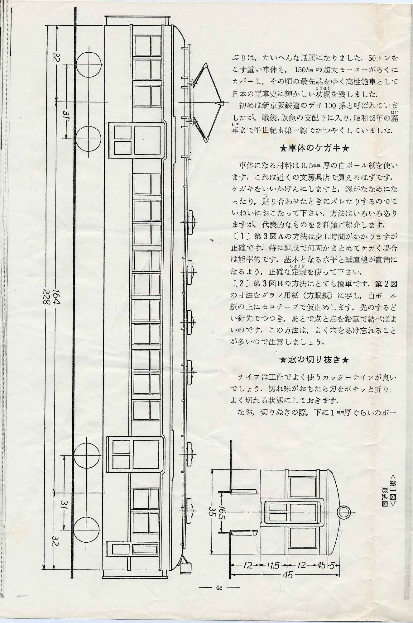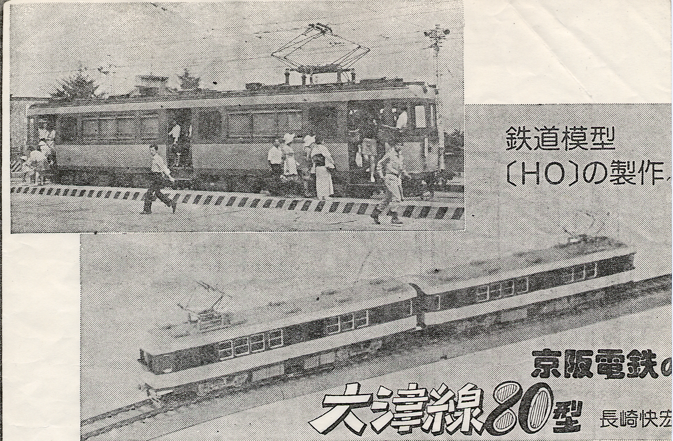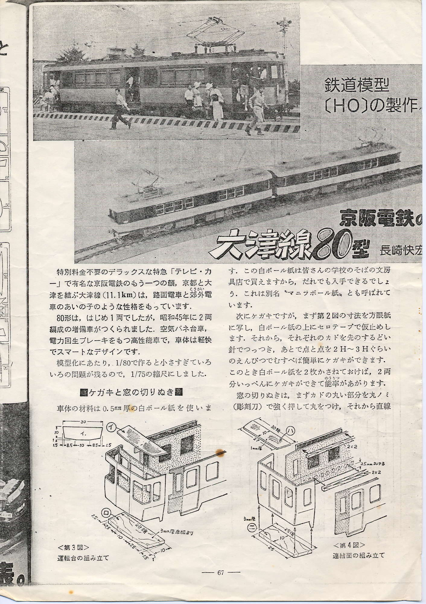 そんなNゲージが出現してからさほど年月も経っていない50年程前のお話です。当時はまだHOゲージが主体でした。模型とラジオという雑誌があり、そこに毎月鉄道模型の作り方が連載されていました。今でも鉄道模型の雑誌で散見される、作例を自慢するものではなく、あくまでも小中高生に作り方をしっかり教えるものでした。近所の図書館にその雑誌があったので、それを借りて、近場で唯一コピーができた文房具屋さんでコピーをしました。下記がそのコピーになります。京阪の80系と阪急の100系の記事です。