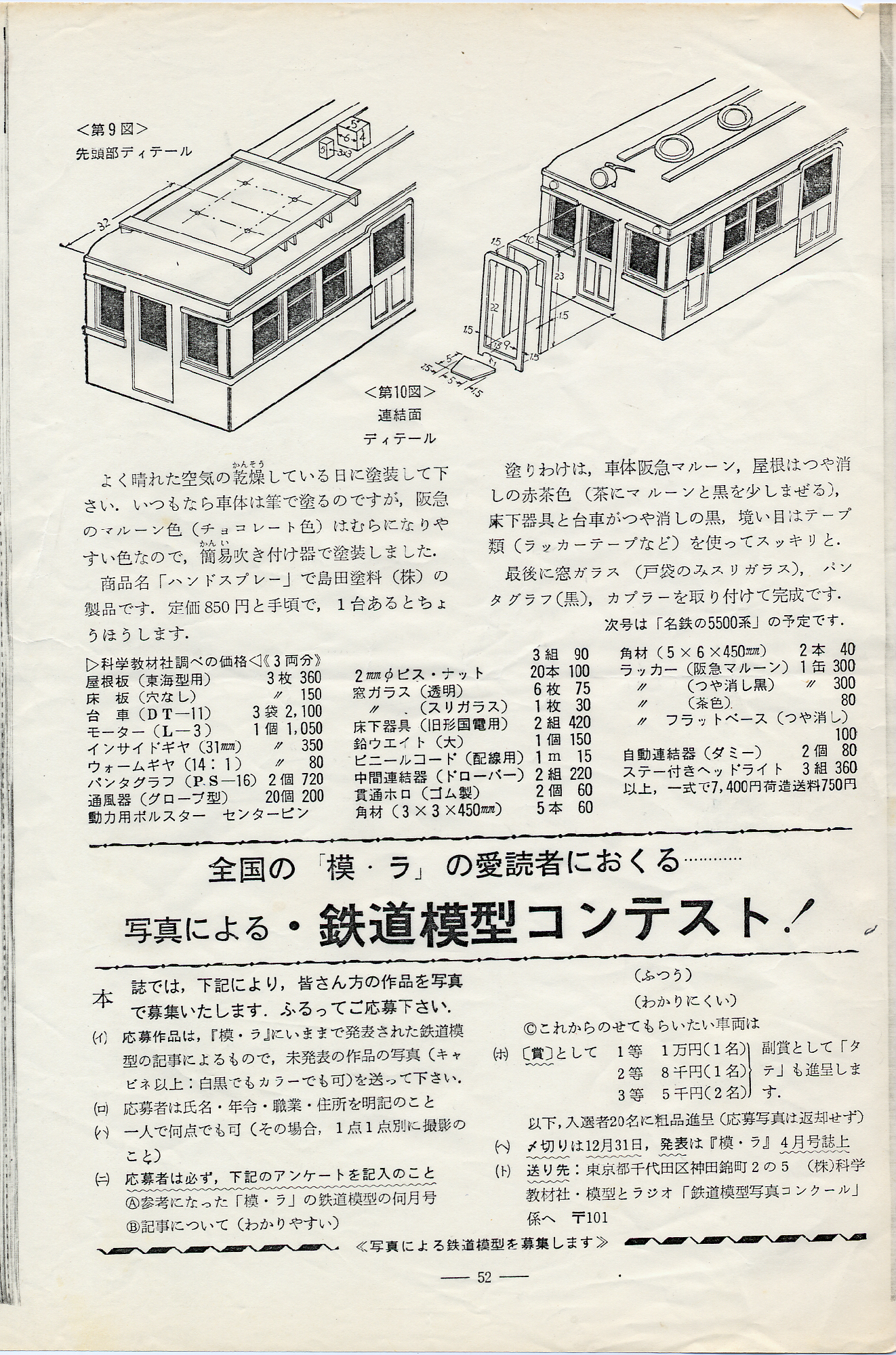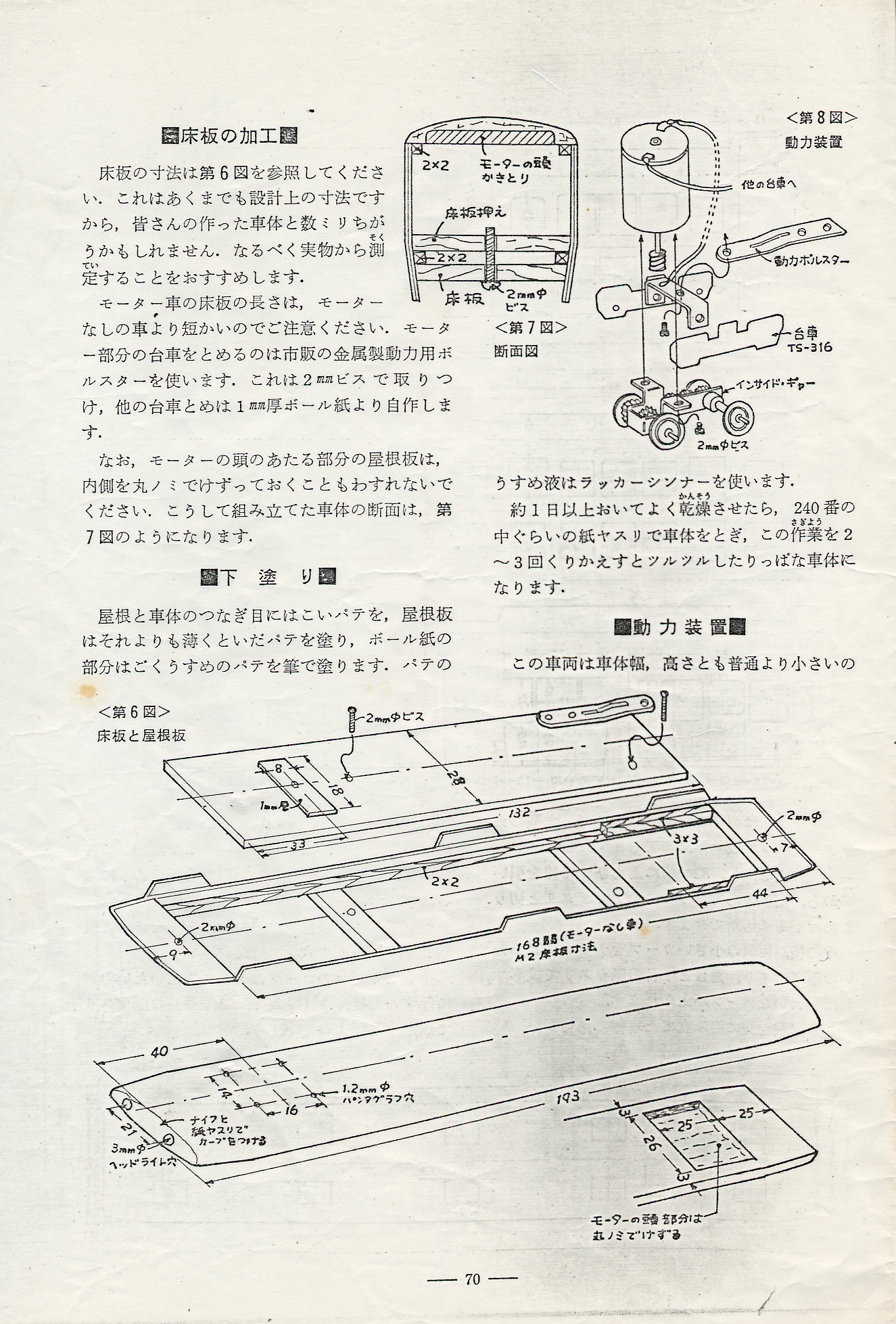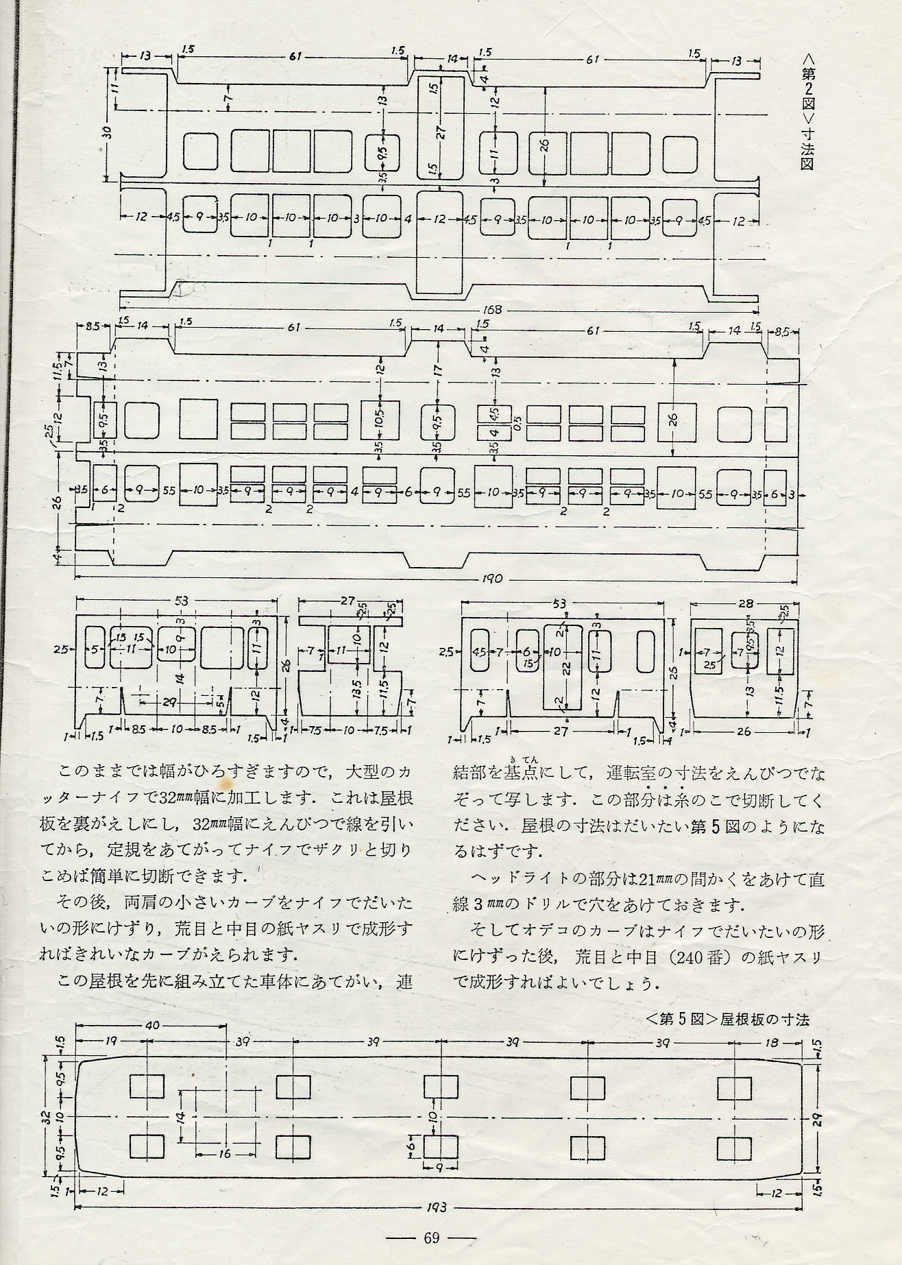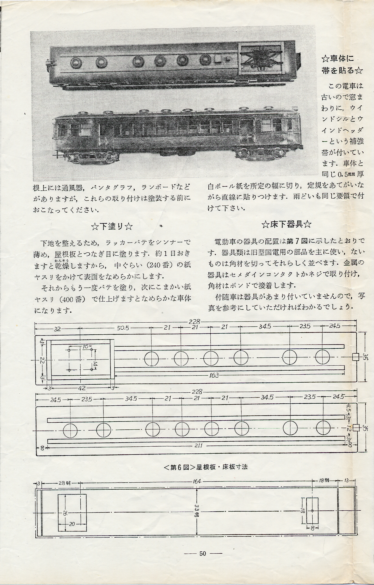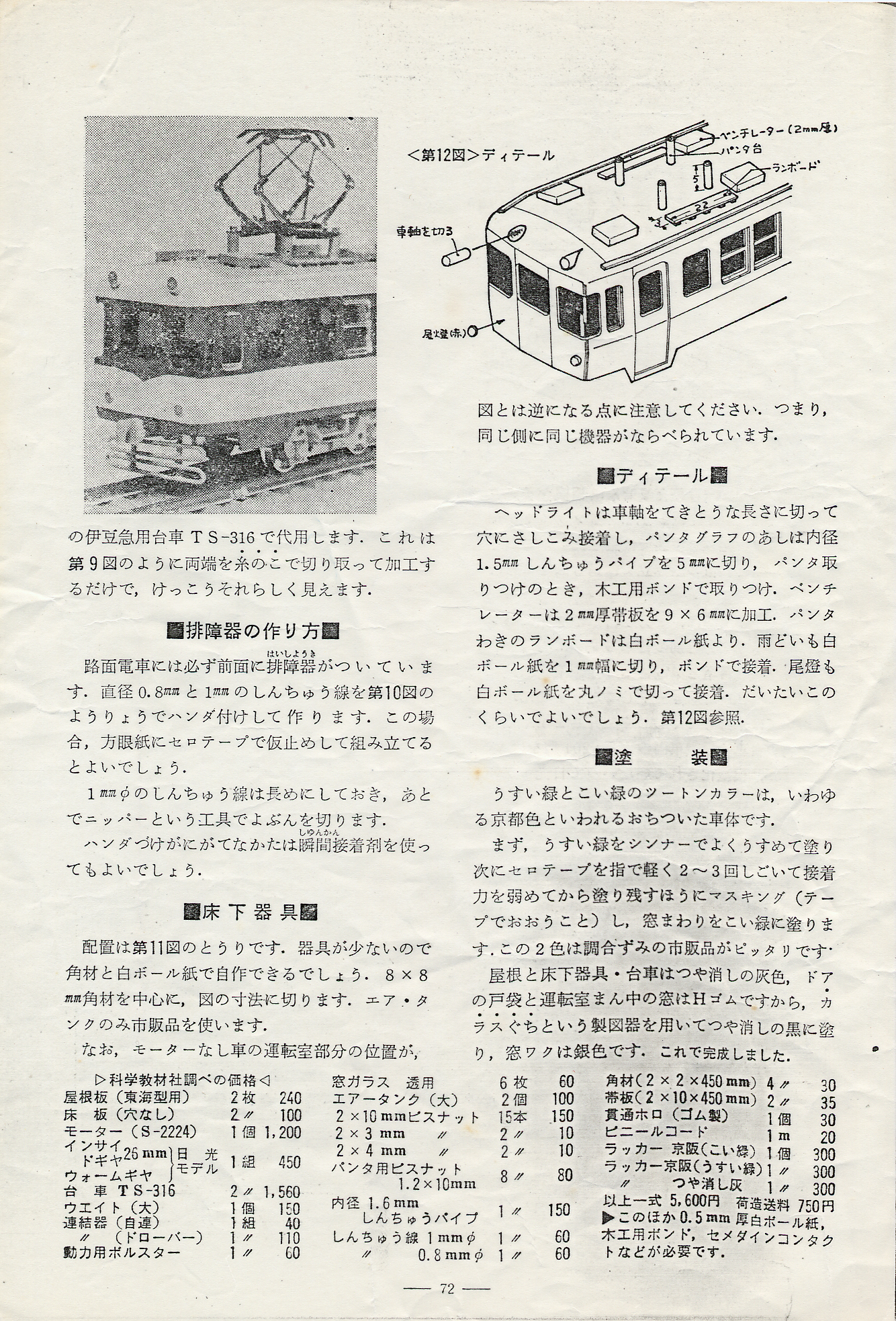 そんなNゲージが出現してからさほど年月も経っていない50年程前のお話です。当時はまだHOゲージが主体でした。模型とラジオという雑誌があり、そこに毎月鉄道模型の作り方が連載されていました。今でも鉄道模型の雑誌で散見される、作例を自慢するものではなく、あくまでも小中高生に作り方をしっかり教えるものでした。近所の図書館にその雑誌があったので、それを借りて、近場で唯一コピーができた文房具屋さんでコピーをしました。下記がそのコピーになります。京阪の80系と阪急の100系の記事です。