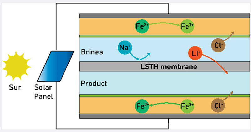 LSTHの構造が図1eに出ています。LSTH 膜の格子特異性はリチウムイオンのみの交換であるため、他のすべてのイオンの通過が制限され、他のイオンは塩水流に保持され、リチウムイオンのみが抽出流に浸透するとあります。