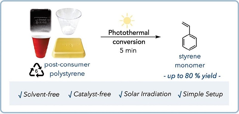 そこで、図1Dに示されているように、今回の研究例では、黒いプラスチック、あるいはたとい透明でも黒いプラスチックスと混ぜることで、いずれの場合も1時間までにモノマー(スチレン)に分解でき、収率が80%ぐらい、添加剤なし、簡単なセットアップで行える方法を見出したようです。