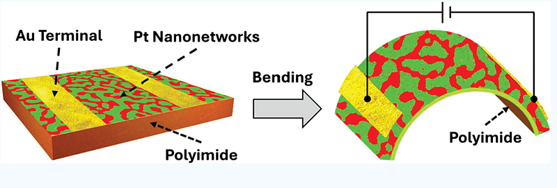もっとも、今回の研究例では、フレキシブル・エレクトロニクス(曲げても大丈夫な電子基板とか)の導電性材料には、インジウム・スズ酸化物(ITO)が広く用いられているみたいですが、もろいため、繰り返し曲げるには都合が悪いそうです。そこでその改善策として白金(Pt)ナノネットワークの導入を考えたようです。ポリイミド(PI)基板上に、白金-セリウム(Pt-Ce)合金の薄膜のナノ相分離を引き起こして、白金と絶縁性の二酸化セリウム(CeO2)のナノ混合物を開発したようです。