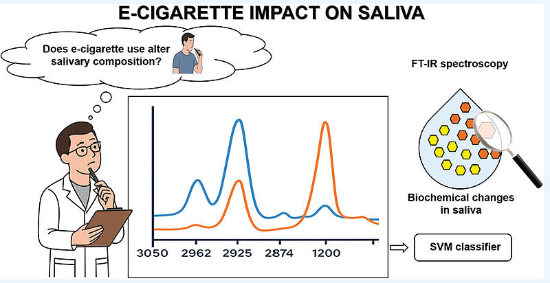 電子タバコを使っている学生と、そうでない学生との違いを唾液をFT-IRで測定して調べた研究例です。