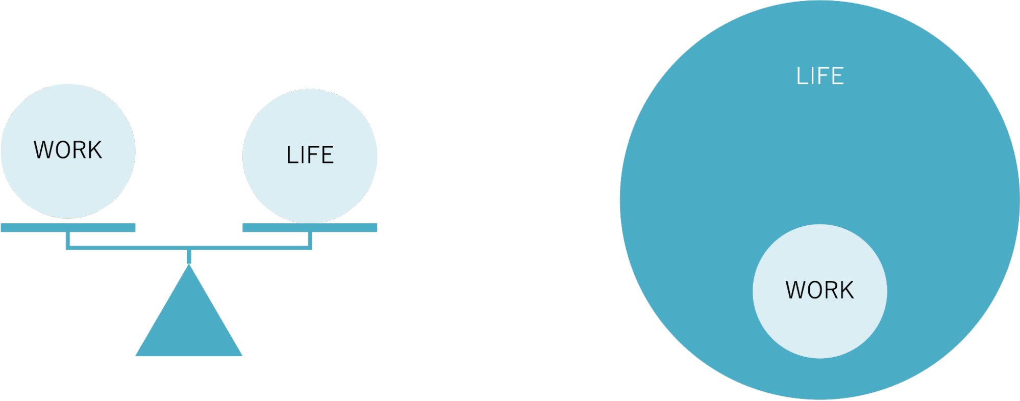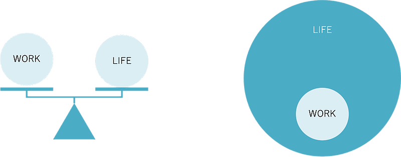 ワークライフバランスは「work(仕事)」と「life(生活)」が天秤のように釣り合っているイメージではありません。そもそも考えてみれば、これはおかしなイメージです。仕事は生活の一部に過ぎません。一部が全体と釣り合うことはないのです。