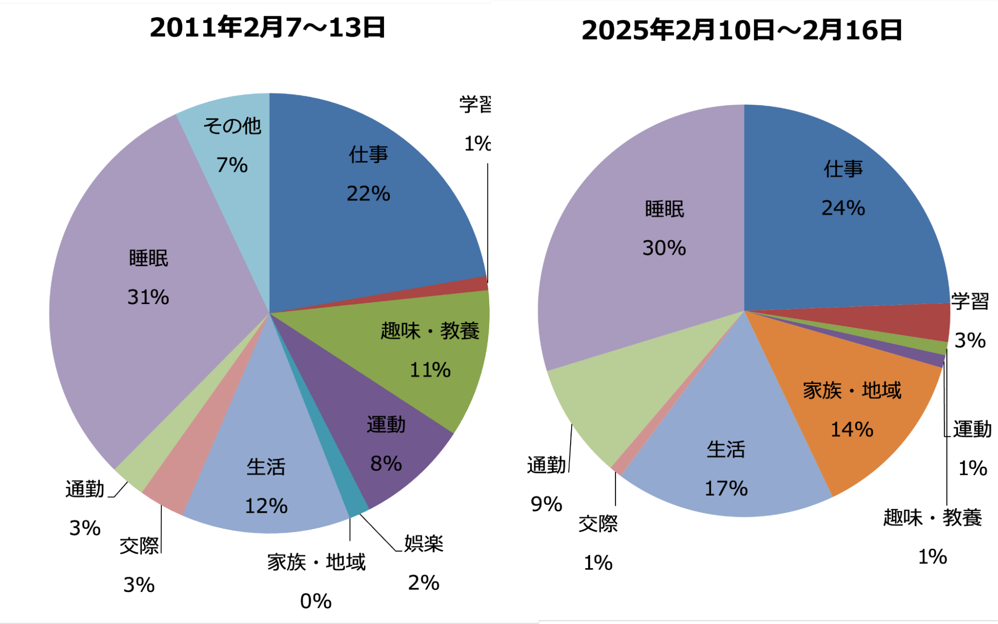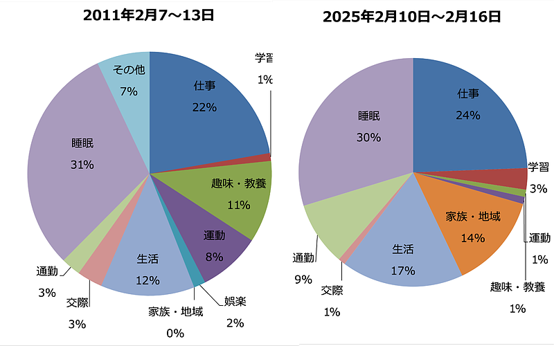 14年前と現在の配分を並べると、生活環境や状況、役割の変化により同じ人間でも活動のバランスが明らかに変わることが分かります。まさに「生活は時間でできている」と言えるのです。