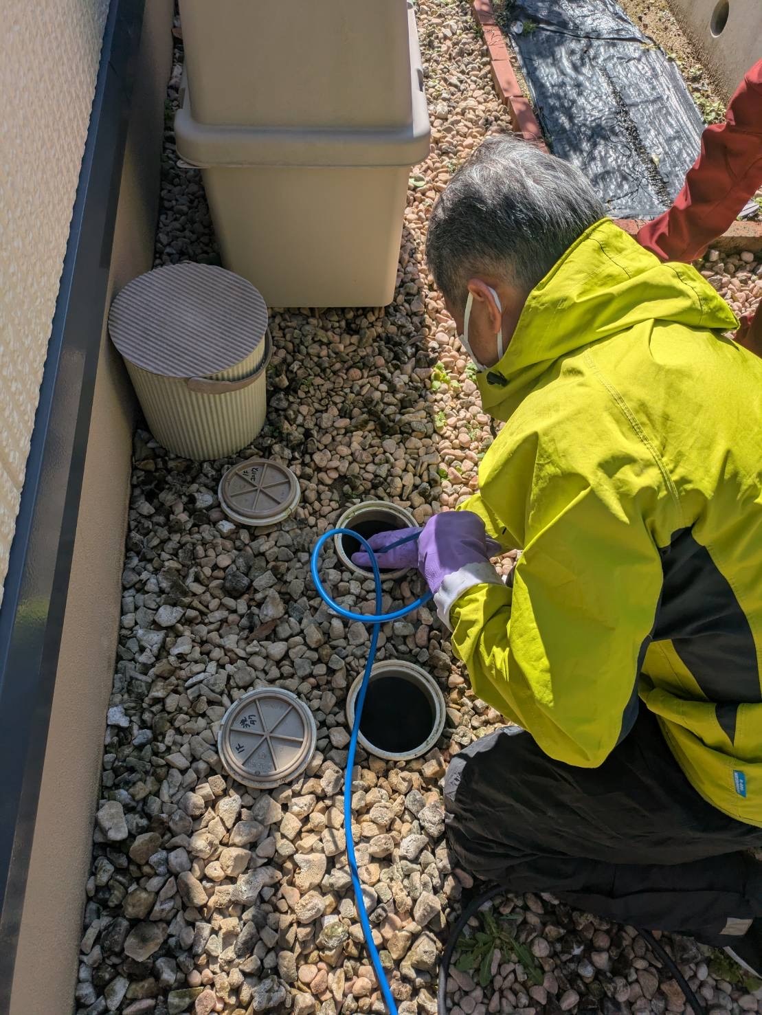 数日後、スタッフが訪問し、外の排水枡を開けて配管の中をチェック。