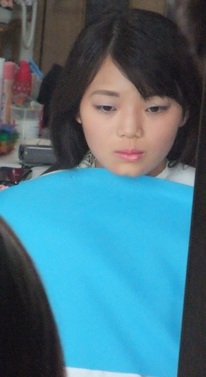 ヘアスタイルのポイントは、トップにボリュームを出し前髪は斜めに