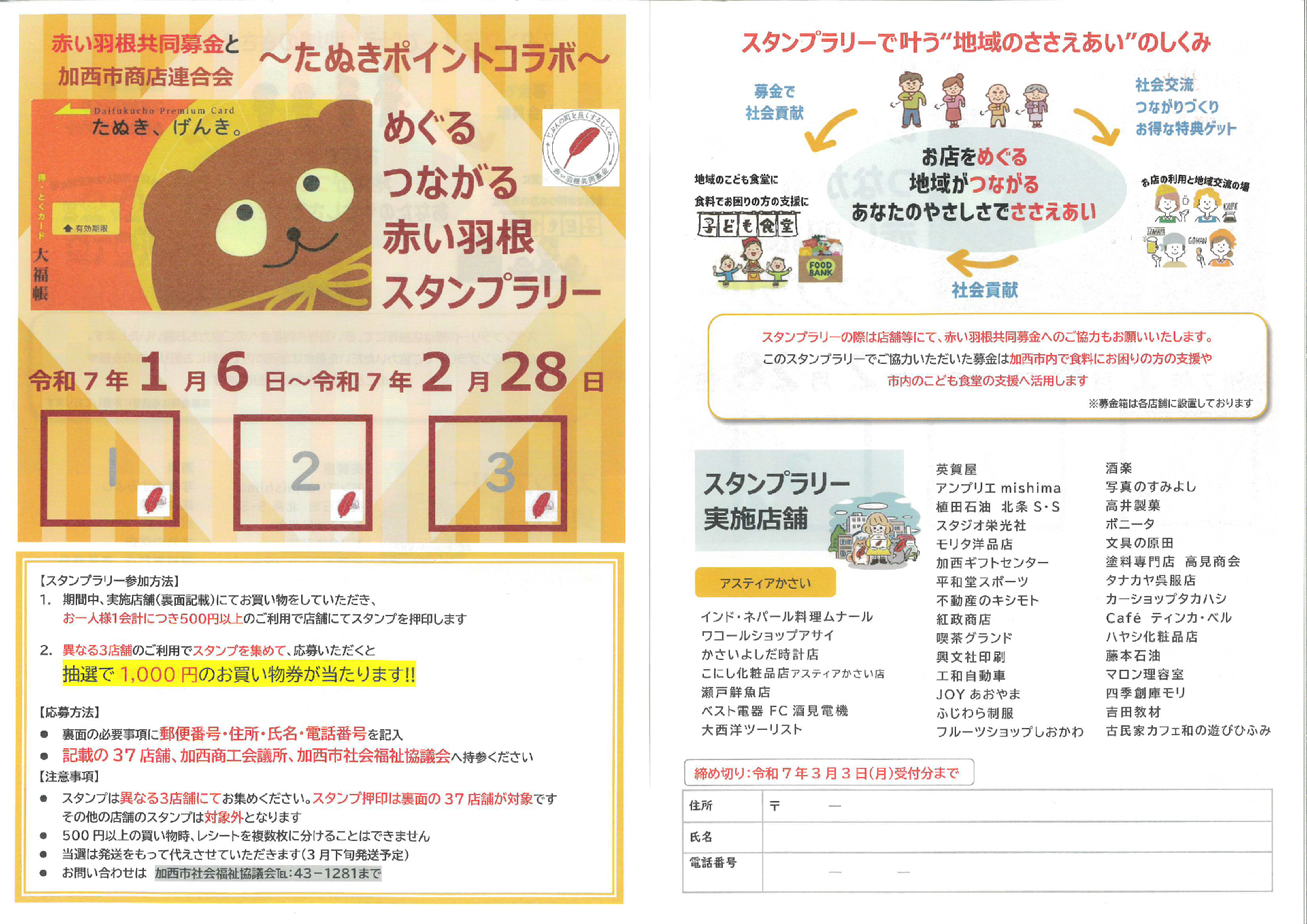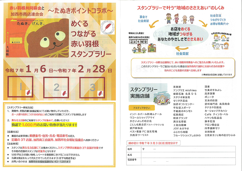 裏面の加盟店で、500円以上のお買い物でお店のスタンプもらってください!異なる3店舗応募いただくと