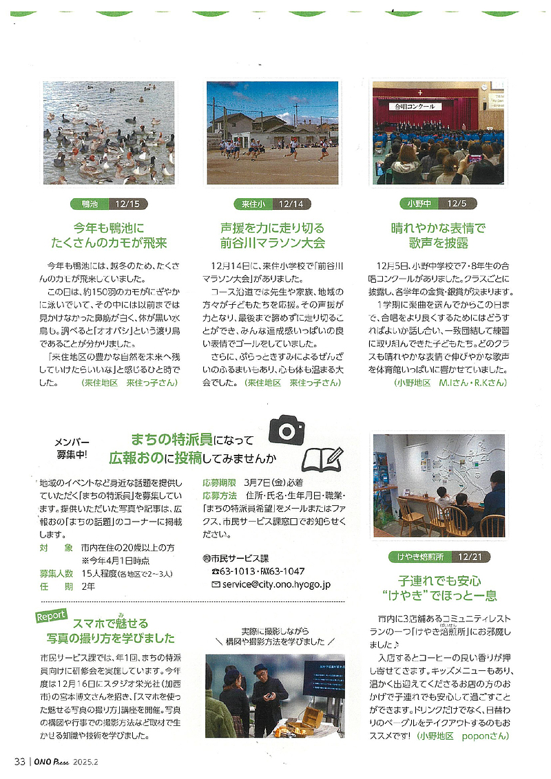 広報おの2月号では『まちの特派員向け写真教室』の様子が、広報kasaiでは『現代の名工受賞』の報告記事を掲載してくださいました。