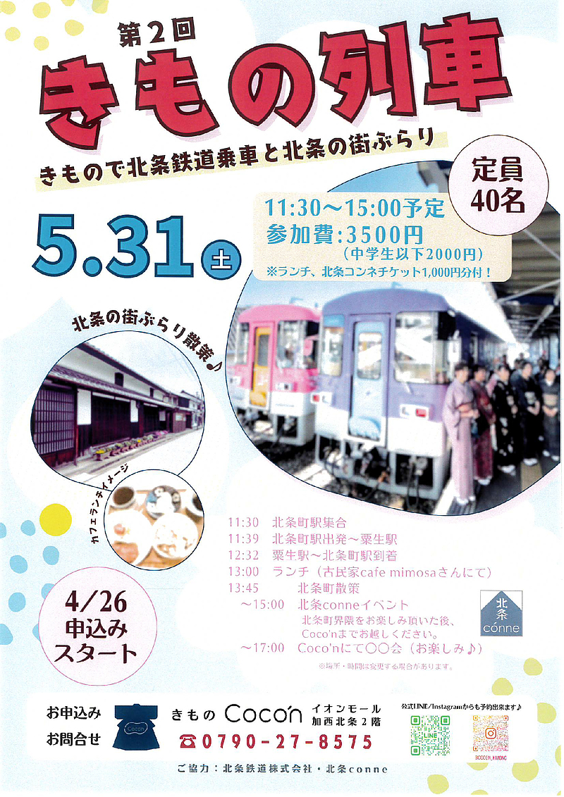 5月31日、きもの Coco'n(イオンモール加西北条2F)様の「お得な!:きもの列車イベント」が、まだ間に合います!