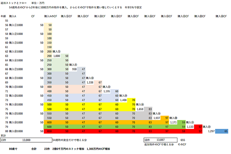 現金で2年毎に1,000万円の不動産を買い続けて、その運用益でもさらに不動産を増やしていくとどうなるか?