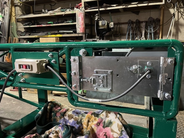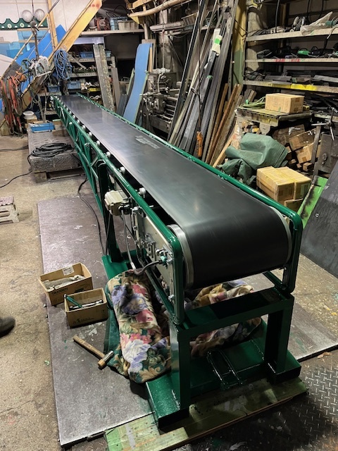 コンテナからの荷下ろしで使用します。ベルトコンベアの自重が約470㎏!傾斜脚・フォークポケットを取付けました。フォークリフトのフォークを差して移動させます。既存品はフォークポケットが1個でしたので不安定でした。今回は左右2個にフォークを差すかたちになりますので安定した移動が可能となりました。長さが7mありますのでうまく運べるか気になりましたが、納品してから1か月が経って何も連絡がありませんので大丈夫だったようです。色は汚れが目立たないようにと濃い緑色で塗装しました。ベルトの回転「正・逆」ありますので、調整に時間がかかりました。
