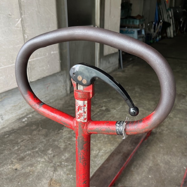 先日、修理のため1台のハンドリフトが弊社工場に持ち込まれました。ま、まさか・・・のハンドリフトでした。コレック最古のハンドリフト「K型」です。