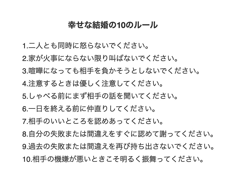 娘の結婚式の時に牧師さんから「幸せな結婚の10のルール」と言うのを教えてもらいました。