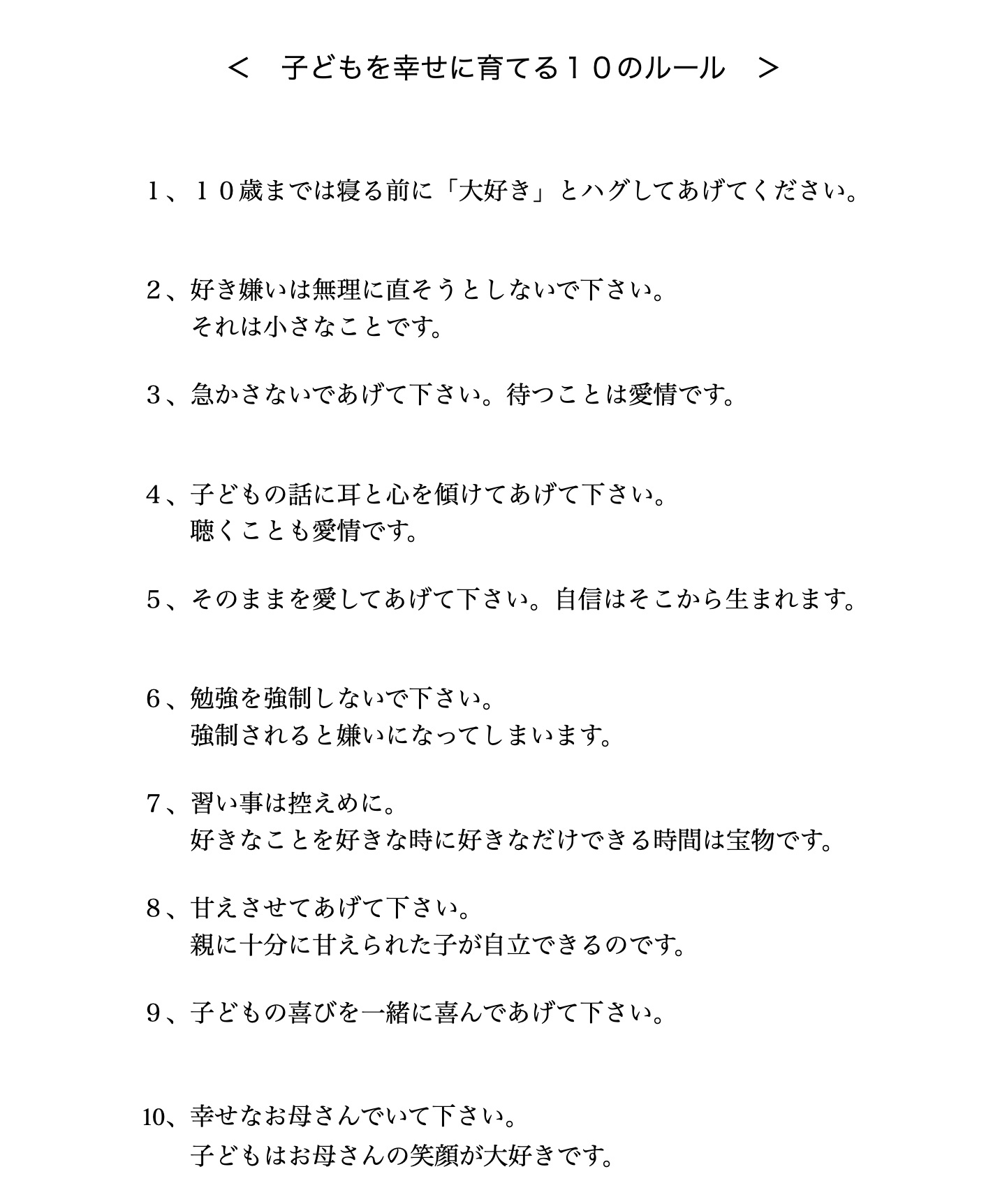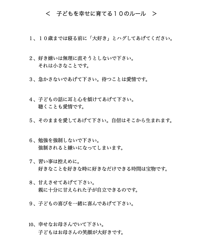 とってもいいお話しだと感激しまして、私もそれを真似て「子どもを幸せに育てる10のルール」というのを作りました。