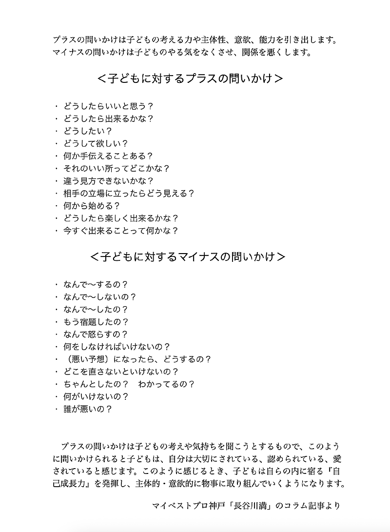 そいう意味では今までの注意・命令・禁止・叱責の言葉の代わりに、もっと子どもに問いかけていくようにすればいいのですが。この問いかけにもプラスの問いかけとマイナスの問いかけががあります。