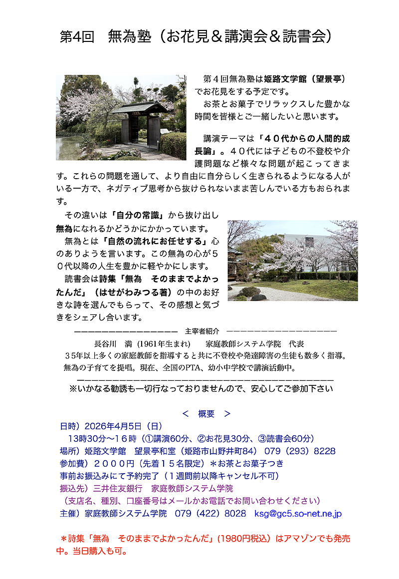 13時30分〜16時(①講演60分、②お花見30分、③読書会60分)