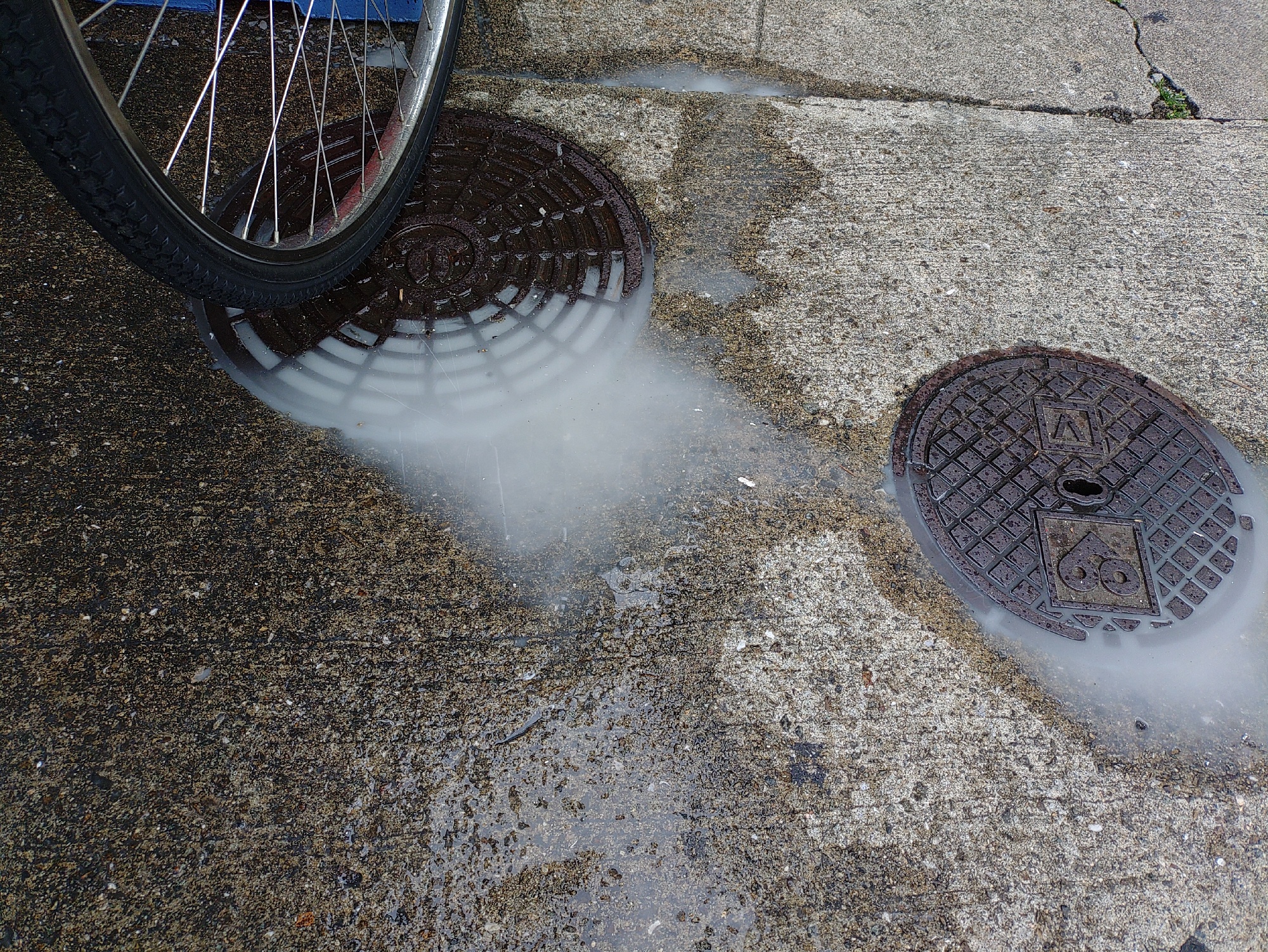 高圧洗浄で洗った水は、こんな感じで白濁しています。。。 古い塗膜が洗われたという事です。