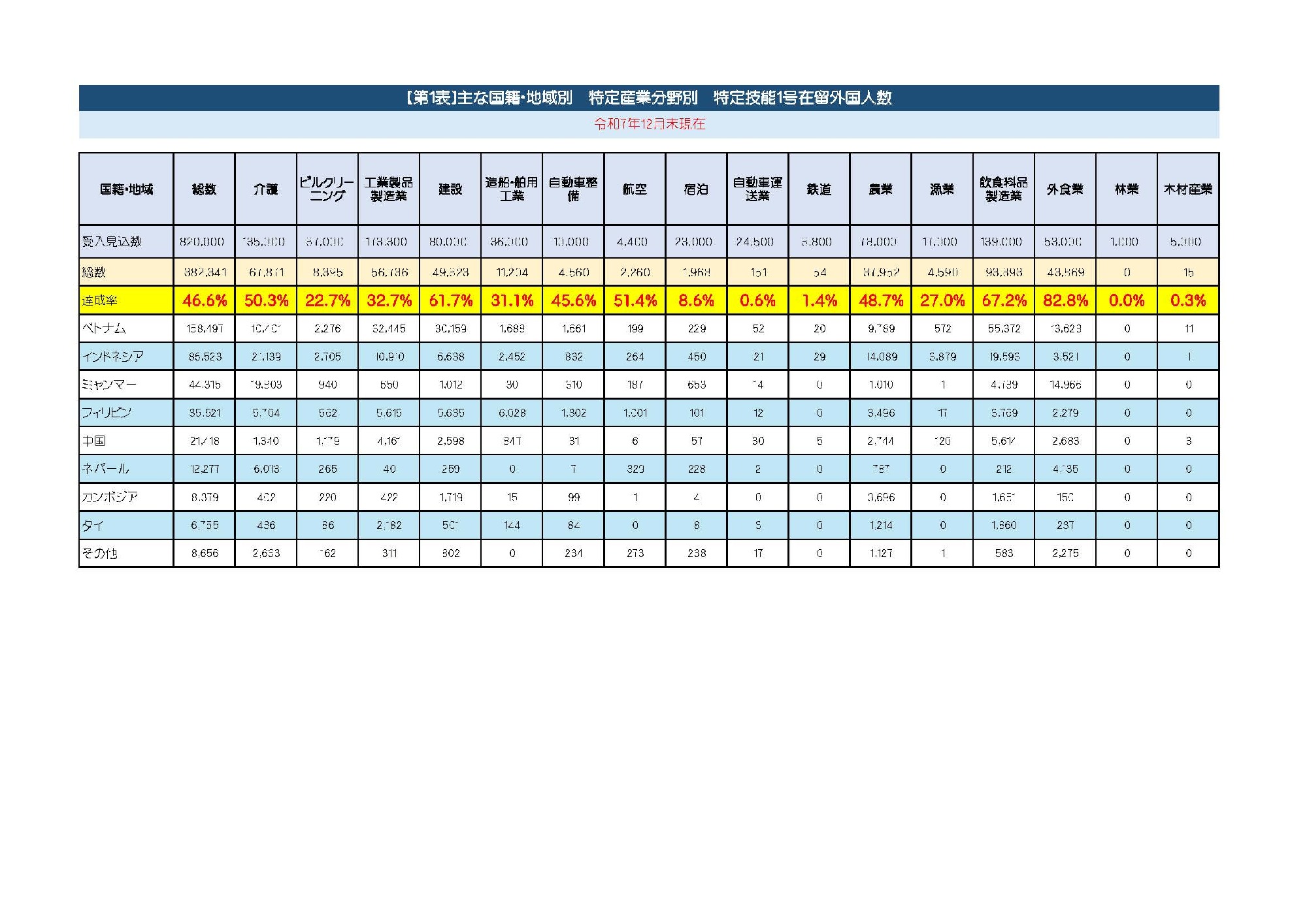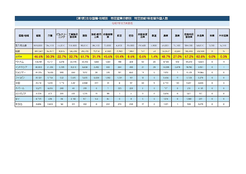【参考】特定技能1号 分野別人数(2025年12月)