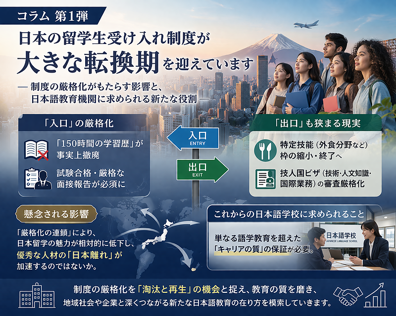 「日本に来たい学生」を集める時代は終わり、これからは「日本で、この学校でなければ学べない価値」を提供できるかどうかが問われます。制度の厳格化という逆風を、教育の質を磨き上げ、地域社会や企業とより深くつながるための「淘汰と再生」の機会と捉え、新たな時代の日本語教育の在り方を模索し続けてまいります。