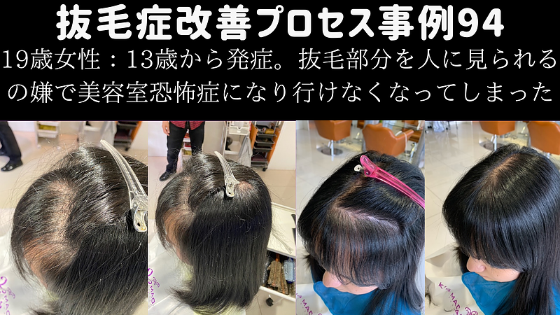 長年抜き続けた事で抜毛部の髪が縮れてしまいピンピン・パサパサ・ウネウネとした髪がコンプレックスとなり美容室で指摘されるのが嫌で行けなくなってしまった為、検索して協会へ