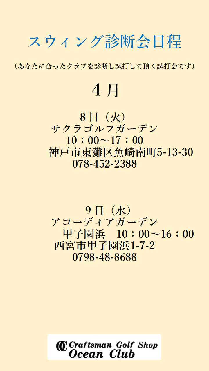 早いものでもう4月ですね。4月度の試打フィッティングイベント日程をお知らせいたします。