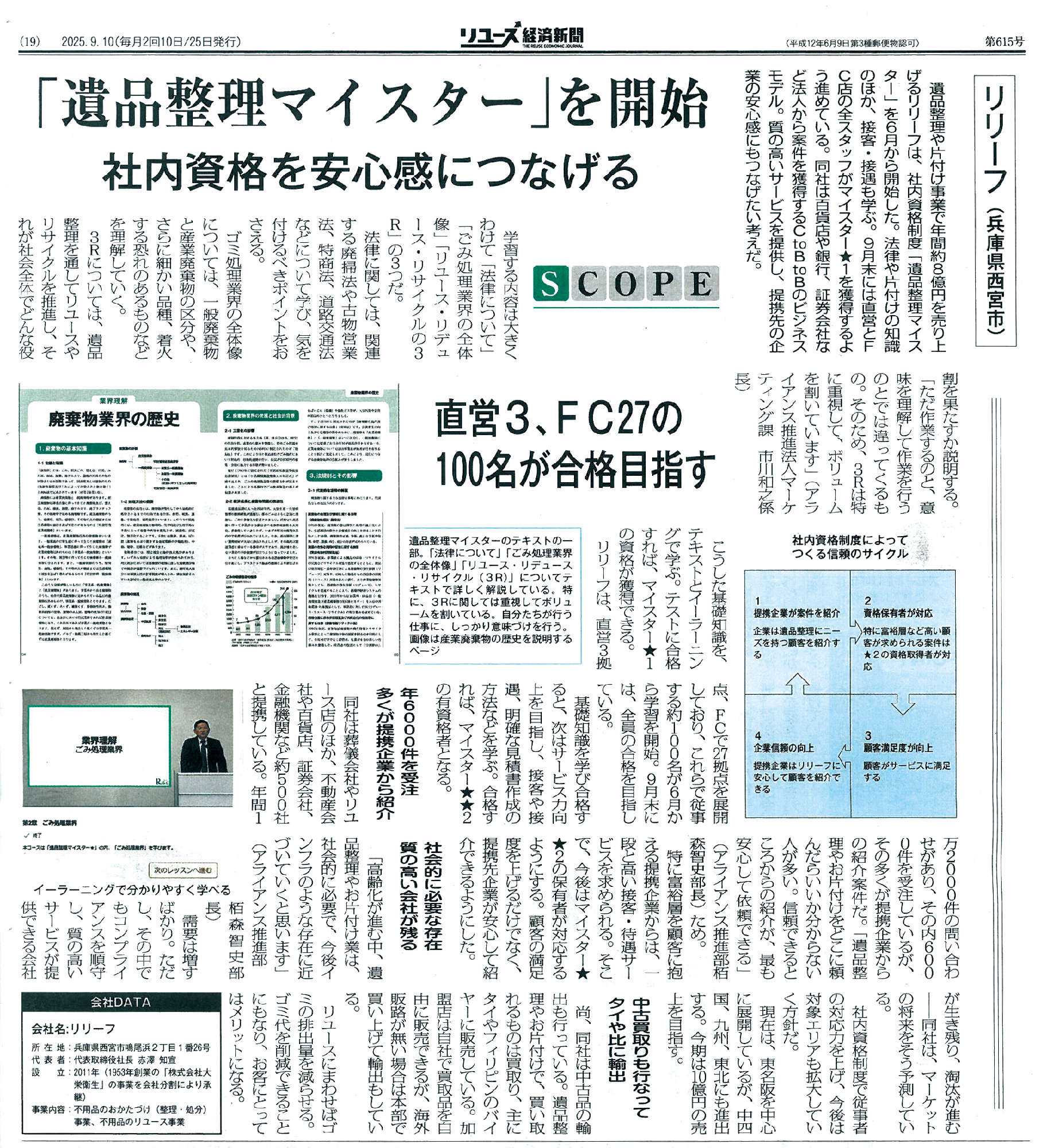 リリーフのスタッフは、全員が社内認定制度「遺品整理マイスター」の資格者です。法律や行政手続き、故人様やご家族への心理的配慮までを学んだ、専門知識を持つプロフェッショナルが対応します。この取り組みは業界紙(リユース経済新聞)でも紹介されました。